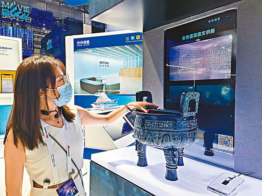 識別西周鼎文的掃描儀,則拉近了現代讀者與遠古文字之間的距離。記者在現場看到,通過人工智能系統,專業掃描工具可以在有弧度有劃痕的仿鼎上,掃描出鼎內文字,並翻譯成現代漢語。這是合合信息帶來的智能文字識別技術,展現了以「彎曲矯正」為代表的智能圖像處理、基於深度學習的複雜場景文字識別以及自然語言處理(NLP)等技術。合合信息市場部負責人王樂晨告訴記者:「這種技術未來可以在博物館以及需要曲面掃描的場景得以應用,我們也帶來了P圖鑒別技術等,希望能在生活中帶來更多的科技便利。」