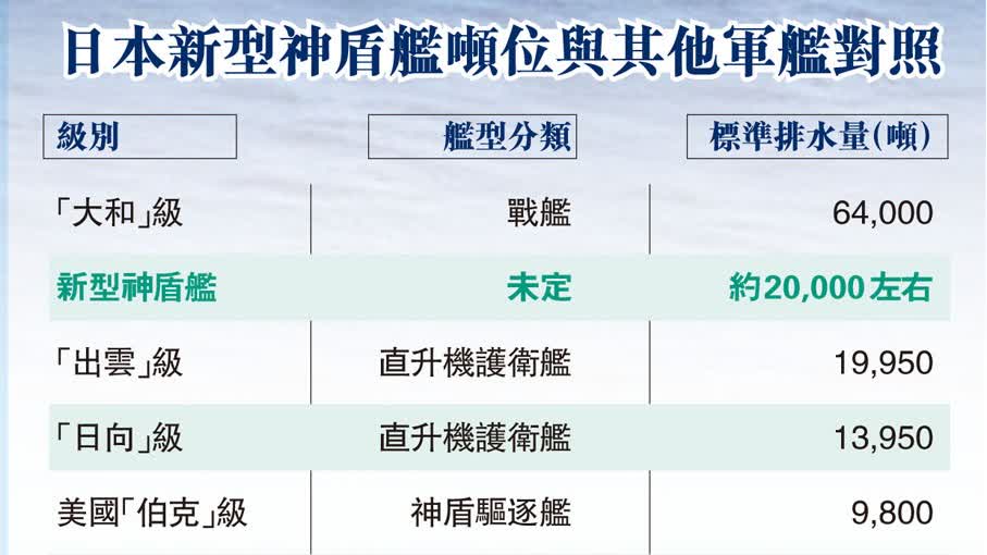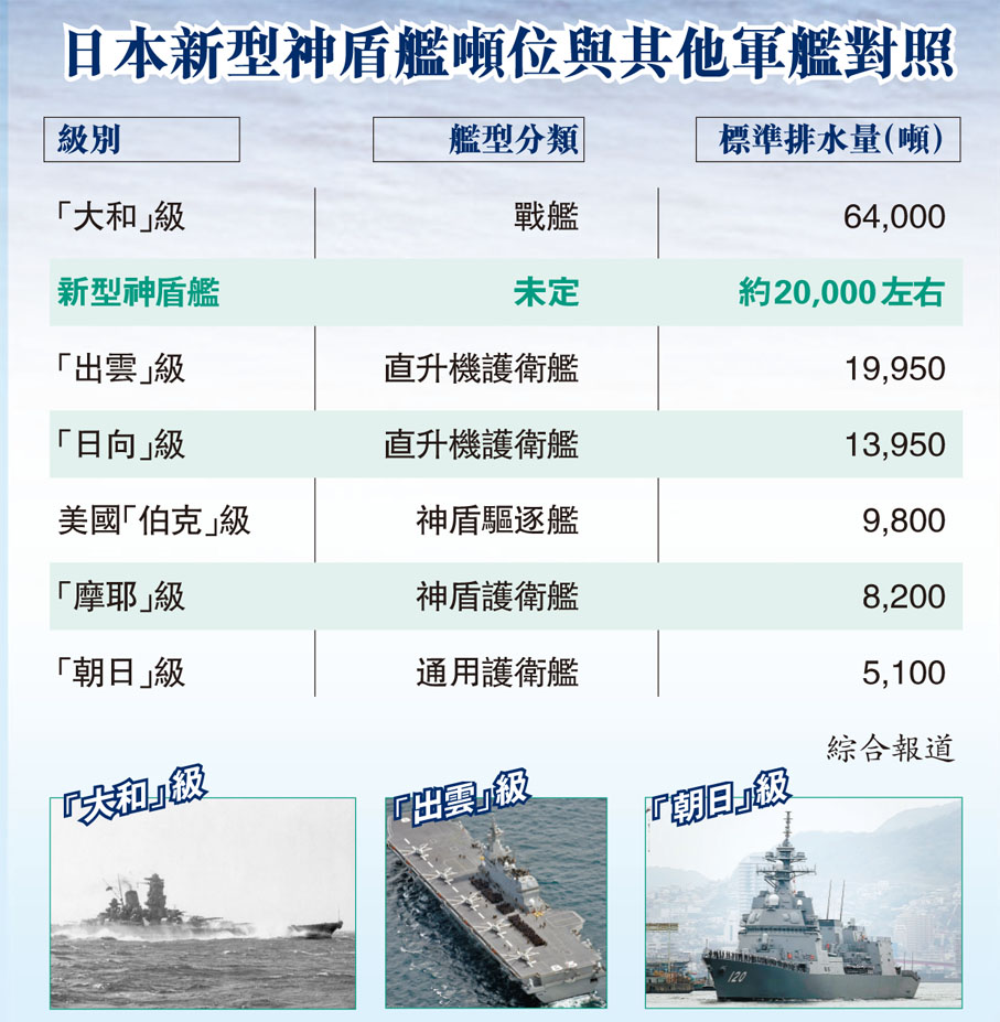 香港文匯報綜合報道,日本防衛省前日公布2023年度軍費預算要求草案,規模達5.59萬億日圓(約3,100億港元)再創新高,當中最引人注目的,是防衛省提出建造用來搭載神盾導彈防禦系統的兩艘大型水面戰鬥艦,當中列明新艦排水量將達2萬噸左右,若然成事,將與海上自衛隊現時最大型的「出雲」級準航母相若,有機會成為日本最大軍艦,堪稱「令和版大和號」。不過日本傳媒引述自衛隊相關人士直言,這艘軍艦最終可能與當年「大和」號一樣,淪為落後時代的無用產物。
