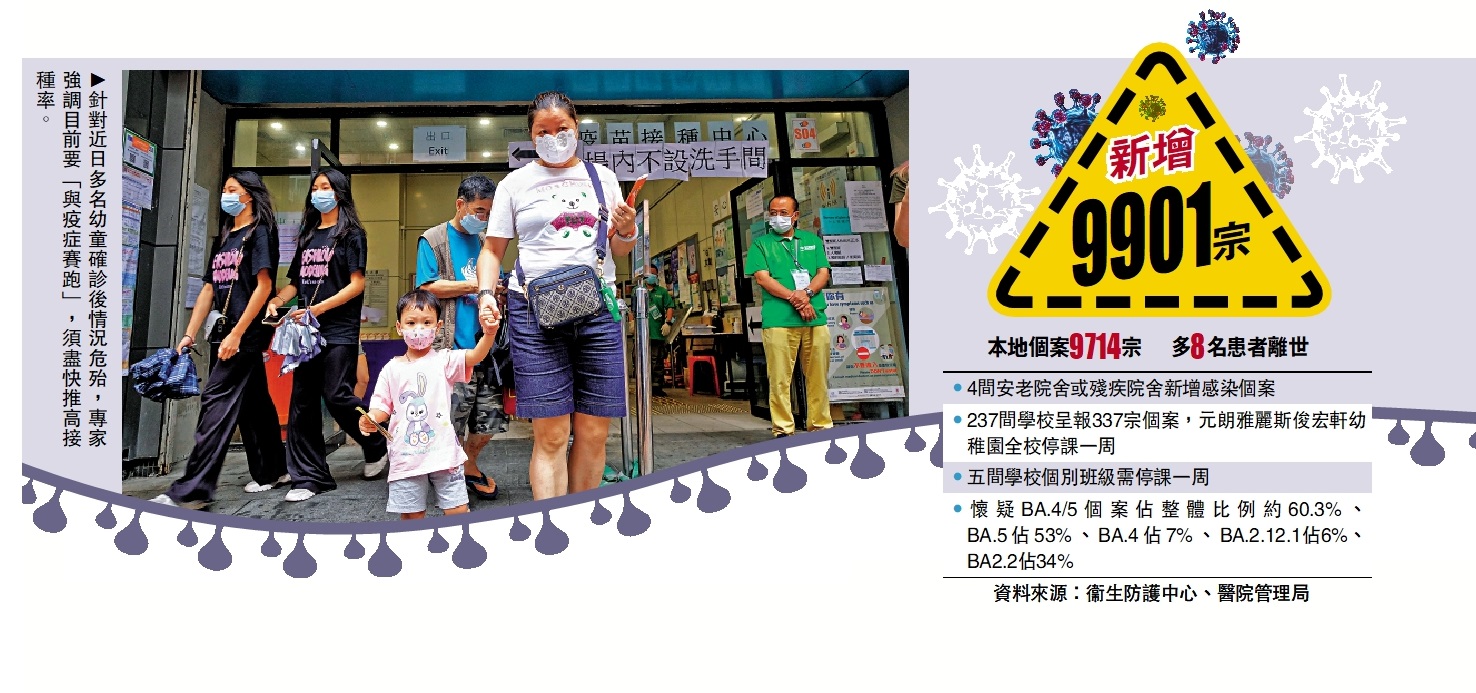 (大公報 記者 王亞毛)新冠肺炎新增確診個案徘徊在一萬宗上下的水平,昨日錄得9901宗,包括9714宗本地確診。開學僅兩天,已有學校需要全校停課,在天水圍的雅麗斯俊宏軒幼稚園,繼早前有個別班需停課後,再有師生確診,共10名學生及9名教職員染疫,需全校停課一周。衞生防護中心傳染病處主任張竹君表示,估計疫情仍在上升,師生每日做快速測試,可有效避免校內爆發疫情。