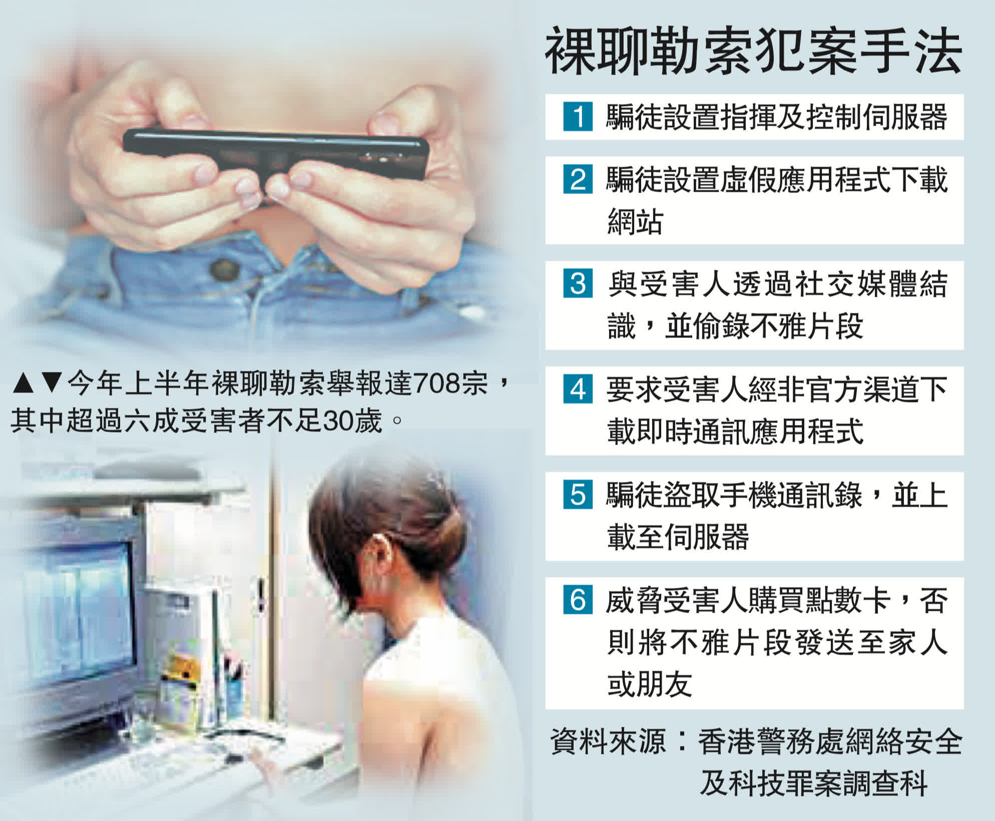 (大公報 記者 古倬勳)網絡罪案肆虐,其中裸聊勒索近年有上升和年輕化趨勢。根據警方數字,今年上半年錄得裸聊勒索舉報達708宗,較去年同期增加43.6%,其中超過六成受害者是30歲或以下,25%是學生,年紀最小僅12歲。