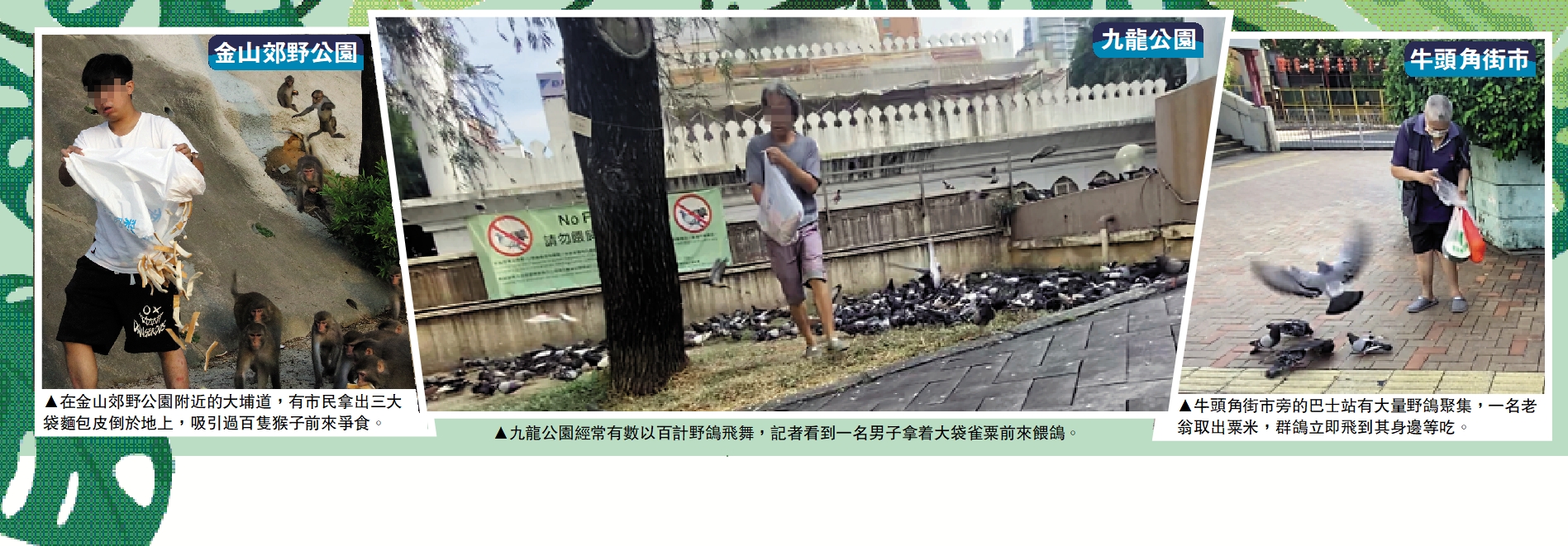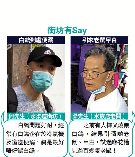 本港多區深受鴿患所困,大公報記者近日走訪多處均看見大量野鴿,並在牛頭角街市、尖沙咀九龍公園及旺角水渠道等地目擊有人餵鴿。其中在牛頭角街市旁的巴士站經常有大量野鴿聚集,當一名老翁到達,群鴿即迅速飛到其身邊,老翁從衫袋取出粟米餵鴿;九龍公園更是野鴿公園,經常有數十隻飛舞,下午時分,記者看到一名男子拿着大袋雀粟前來餵鴿,及後地上留下不少雀粟碎。有管理員向記者說,上址最少有五個人常來餵鴿。