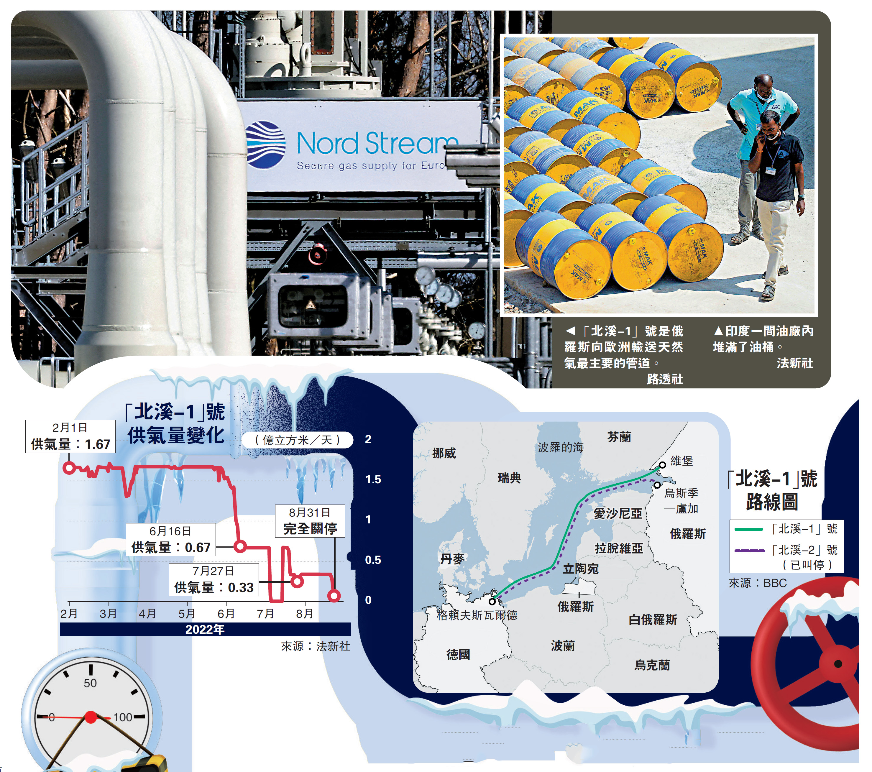 •俄羅斯今年6月中減供60%的「北溪-1」號天然氣,每天供氣量不超過6700萬立方米。7月底又降至20%約3300萬立方米,8月31日,完全關閉該管道。