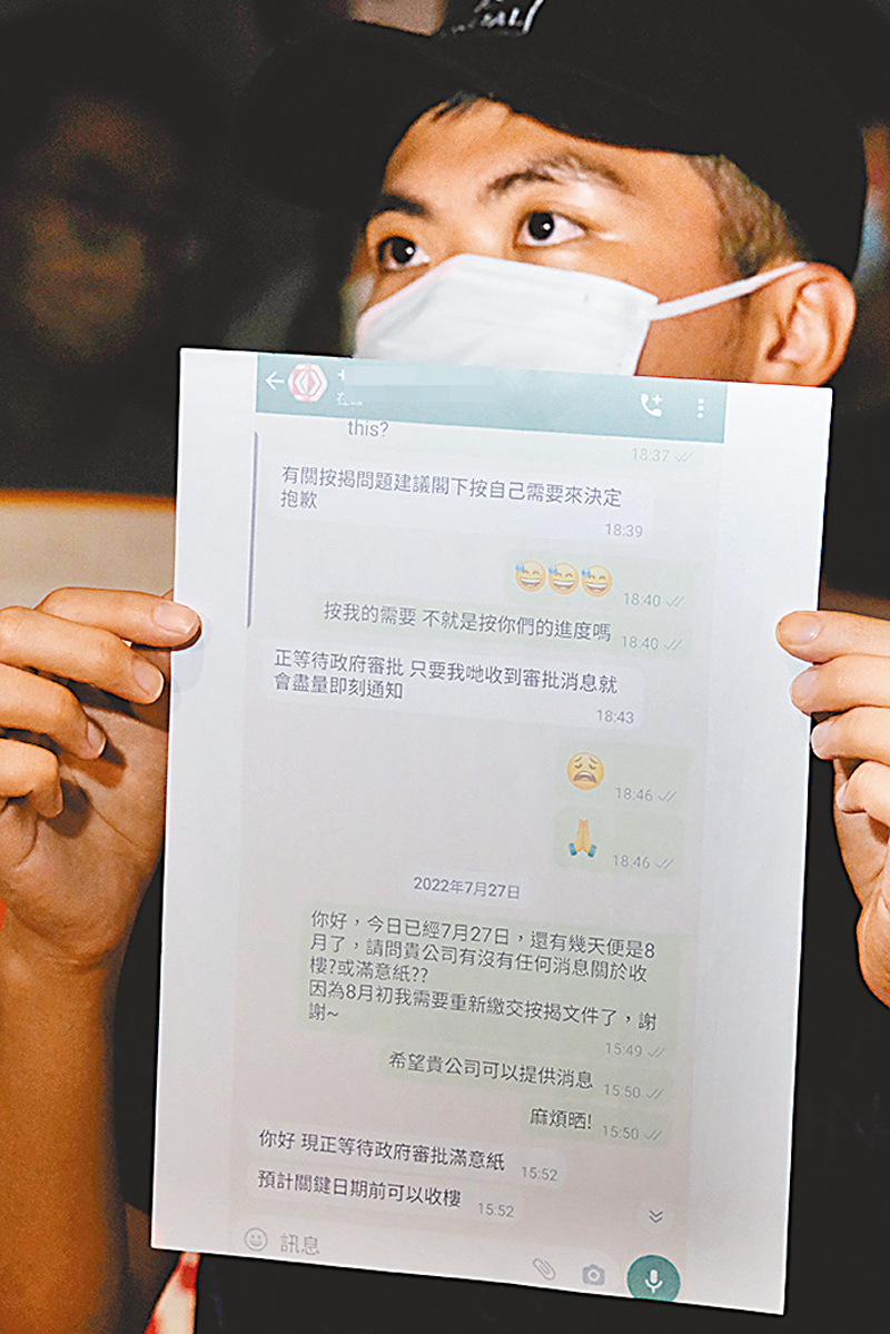 她與丈夫對明年3月底能否收樓也沒有信心,故他們一眾小業主聯署要求發展商作出賠償或無條件讓業主取消交易,但陳先生十分糾結,坦言就算容許取消交易也難以決定是否放棄,「一來仍然希望可以入住,另方面又真係冇信心會唔會再延期。」