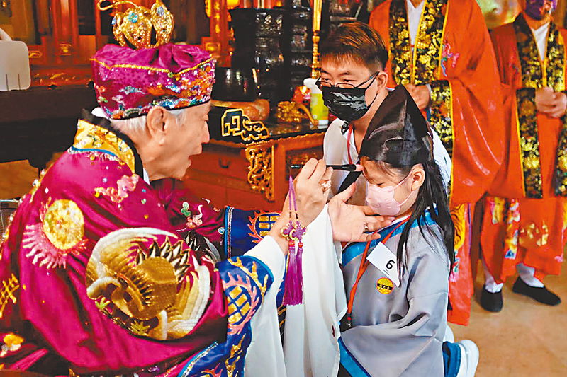 (香港文匯報訊記者 高鈺)開筆禮,是中國傳統中對少兒開始識字習禮的一種啟蒙教育形式。對入讀小學的新生及其家長而言,象徵正式踏入人生的新階段,意義重大。9月新學年剛開始,嗇色園黃大仙祠昨日舉行「萬世師表孔聖先師啟蒙開筆禮」,共有超過130名學生參與。同學們在老師教導下執筆書寫「人」字,又逐一獲硃砂點痣(智)於額頭正中,讓他們在啟蒙開智的同時,明白做人立德的道理。