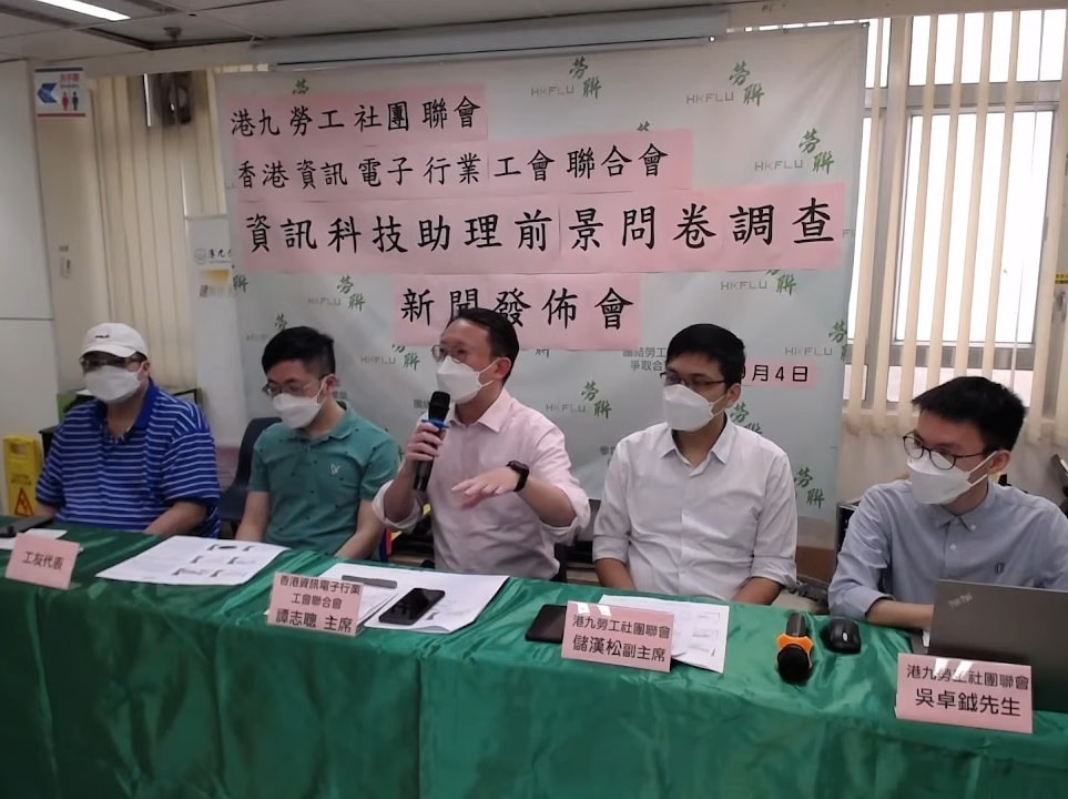 勞聯及香港資訊電子行業工會聯合會,於今年6至8月期間,訪問86名學校資訊科技助理和104名教師。結果發現,近40%受訪者月薪2萬港元以上,惟逾37%受訪者薪酬水平只在1.8萬港元的水平徘徊,甚至有23%訪者月薪僅1.5萬港元或以下。14%受訪者更指過去3年人工「零調整」,20%受訪者指每年平均加薪低於1%或以下。工時方面,約半受訪者指平常要超時工作,有個別每周總工時更長達55至60小時。