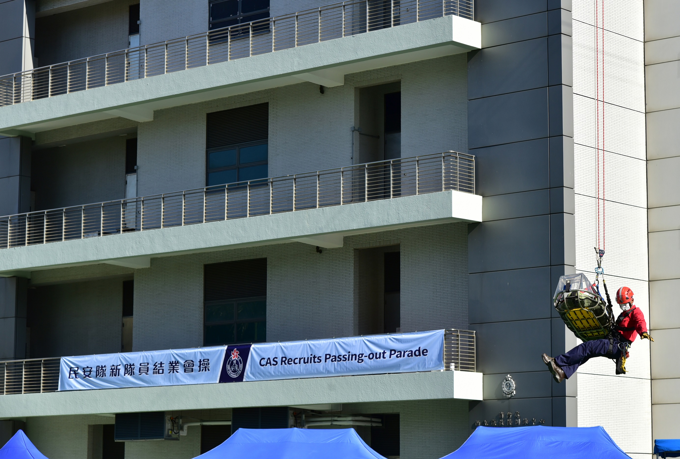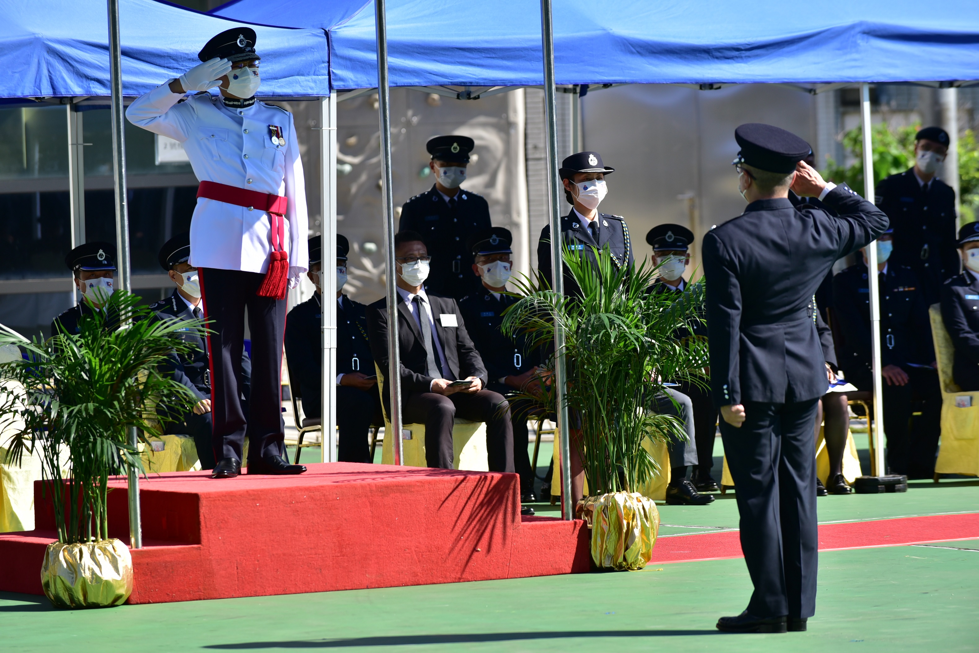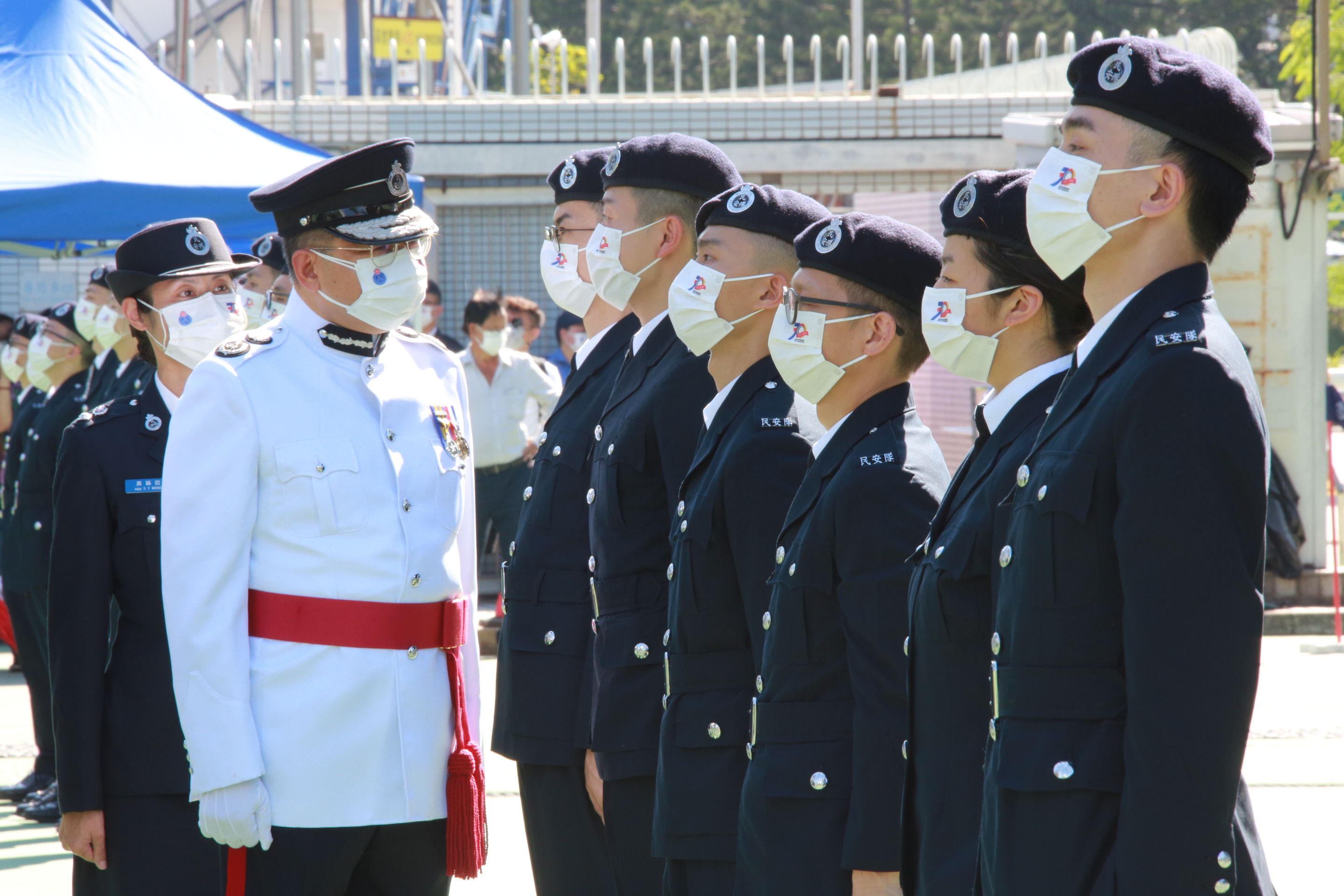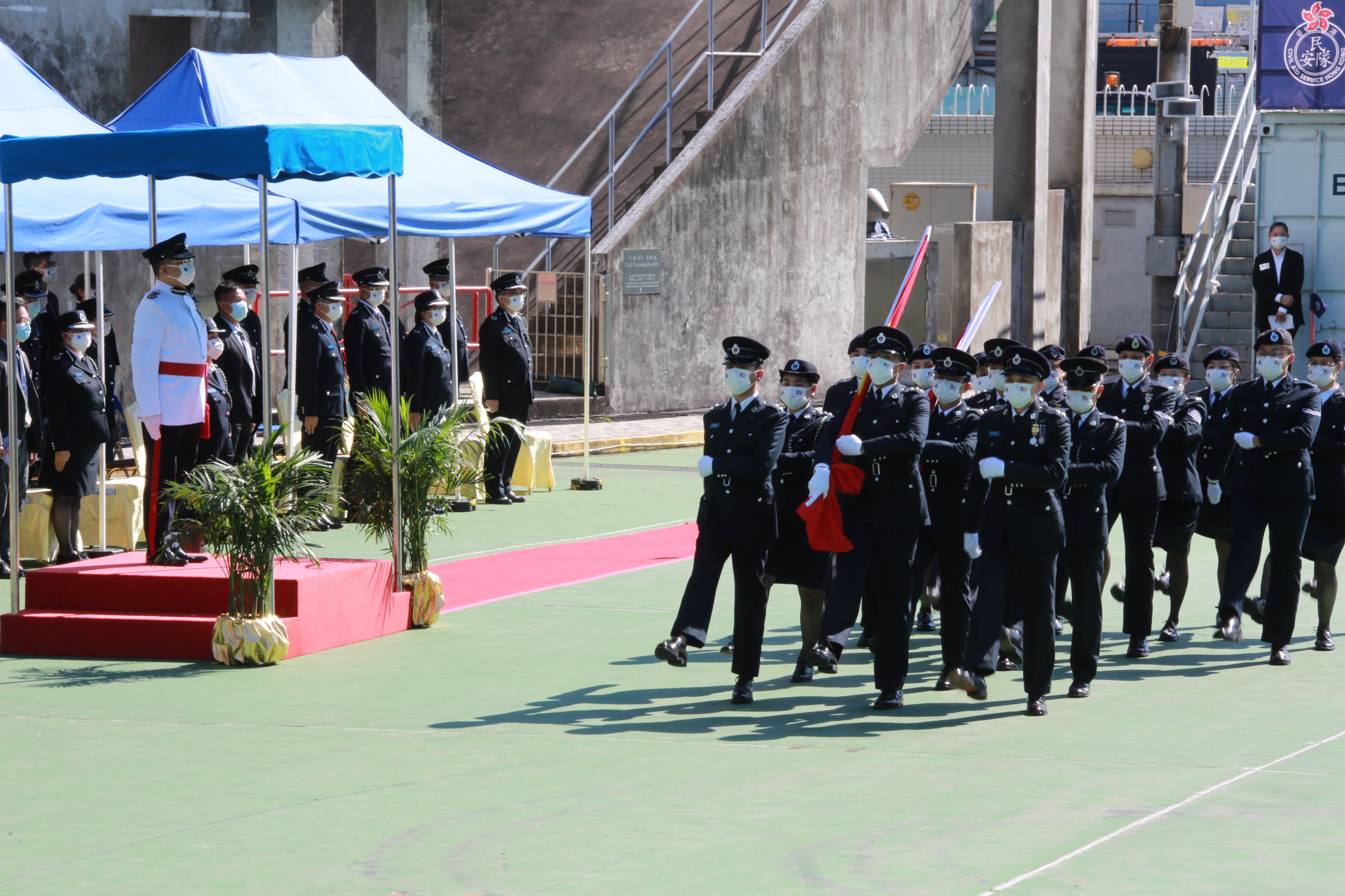 大公文匯全媒體報道,民眾安全服務隊今日(4日)在民安隊總部舉行第八十四屆新隊員結業會操,由民安隊副處長(行政)林國興擔任檢閱官。本屆結業會操的升旗儀式首次由升旗及護旗小隊以中式步操進行。