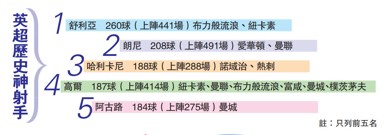 當上季英超神射手之一孫興民仍未開齋之際,哈利卡尼則全面恢復火熱腳風,上周六又有一球進賬,協助熱刺主場以2:1力克倫敦友會富咸之餘,自己亦超越了英格蘭前輩高爾,累積188球獨佔英超歷史射手榜第3位,直追在上的朗尼與舒利亞。