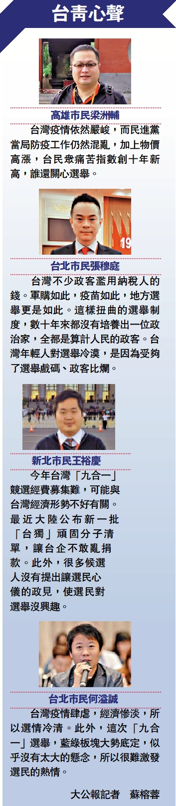 國民黨孫文學校北院院長林定芃表示,民進黨當局執政下,抗疫混亂、民生多艱,其執政無能的醜態盡顯,激起島內民眾憤怒。物價上漲、經濟蕭條,年輕人找不到工作,對政治感到灰心。民眾越來越厭倦政客做秀,不少中間選民已經對民進黨執政下的台灣喪失了信心,不願意在捉襟見肘的生活中再來出錢去支持選舉。