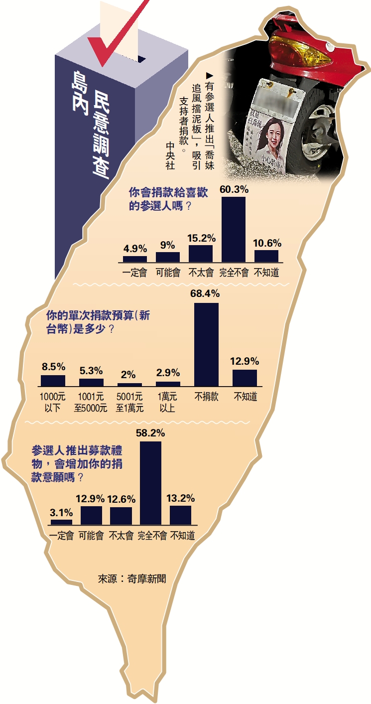 國民黨南市議員林燕祝也說,開設小額捐款賬戶一個月才收到個位數的捐款,以往最少也有近百筆,今年每筆金額也變少,和往年差很大。國民黨台南市長參選人謝龍介很早就成立捐款賬戶,籌募「糧草」,希望支持者捐款。