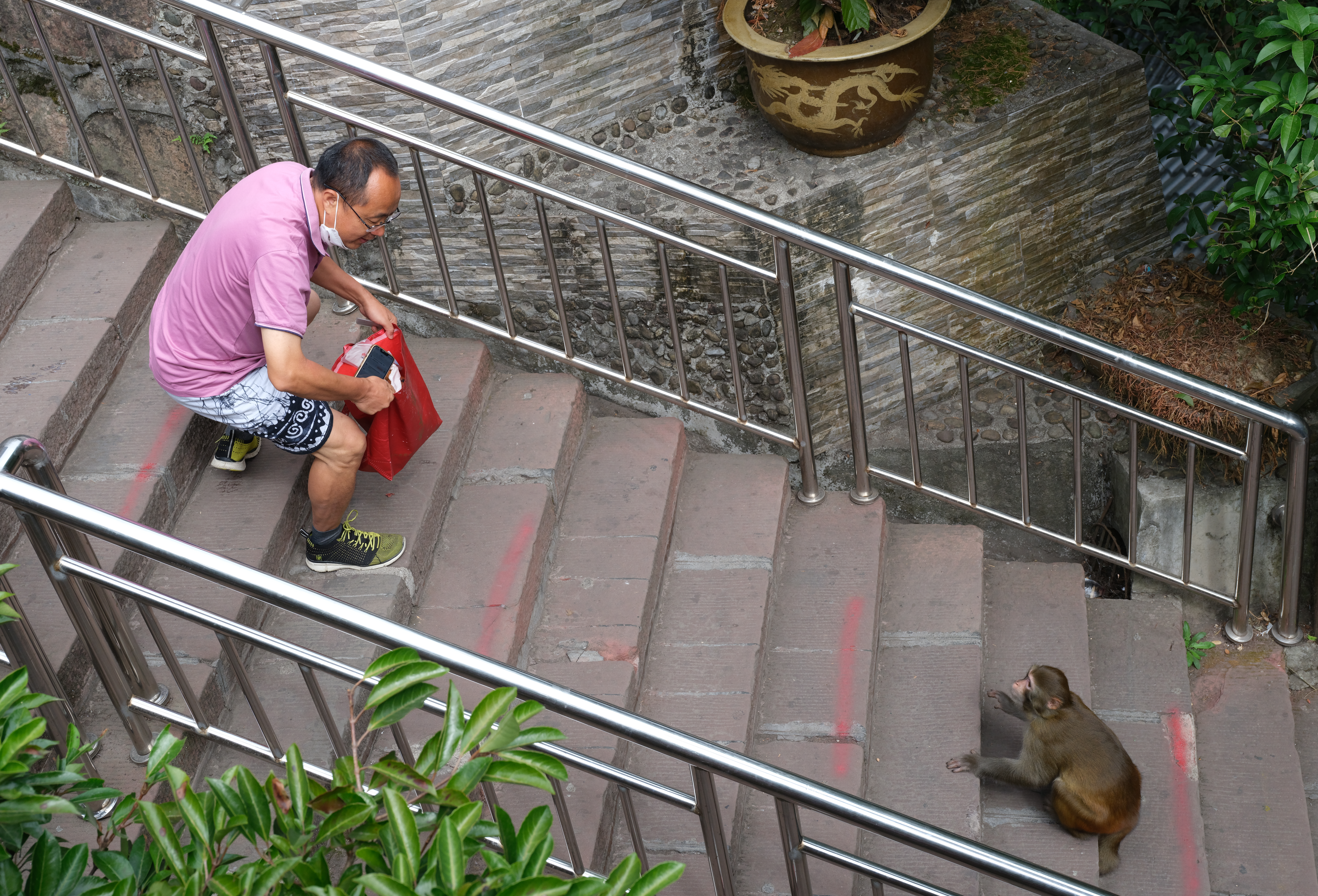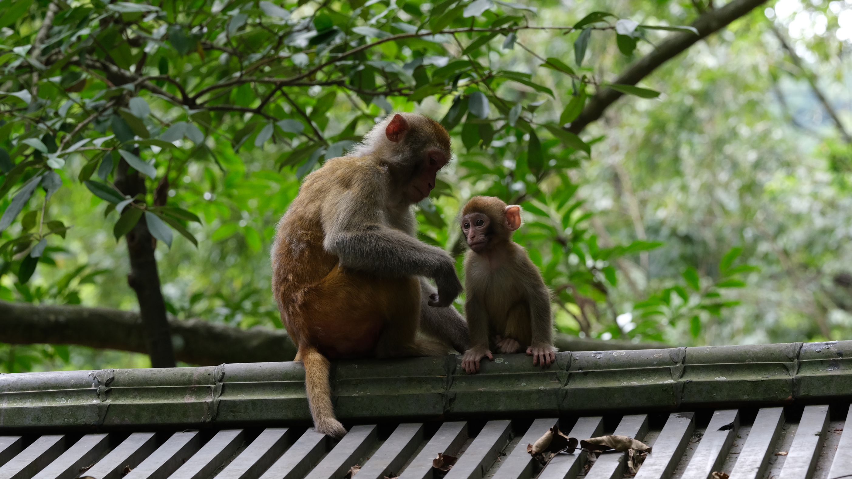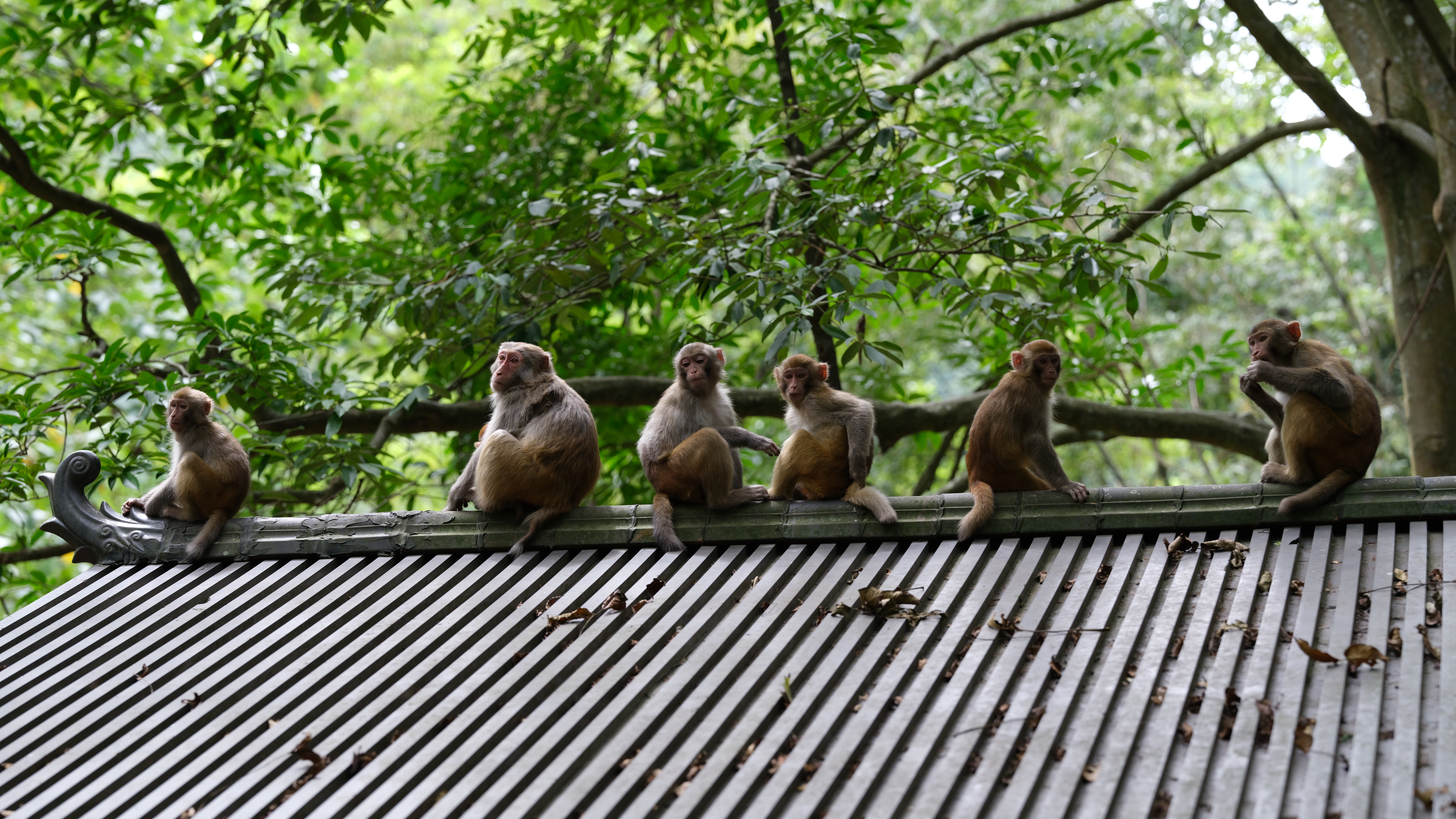 (大公文匯網 記者 姚進)初秋微涼,在湖南張家界武陵源景區,成群結隊的野生獼猴或歇息養神,或行走覓食,有的爬上屋頂休息,神情各異,憨態可掬,為景區增添了不少樂趣。