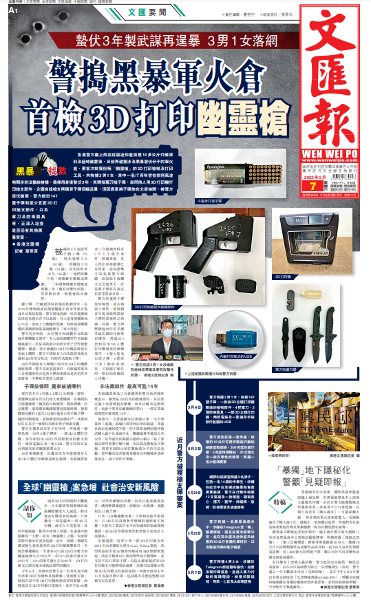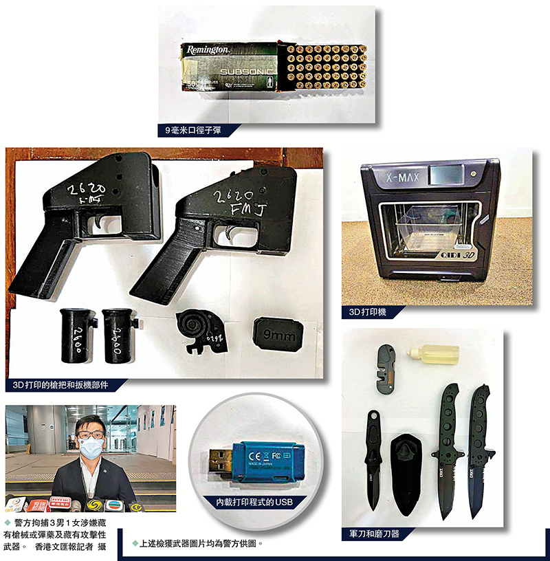 (香港文匯報 記者 蕭景源)香港警方繼上周在紅磡迷你倉檢獲10多公斤炸藥原料及延時裝置後,日前再破獲涉及黑暴潛伏分子的軍火倉,更首次檢獲俗稱「幽靈槍」的3D打印槍械及打印工具,共拘捕3男1女。其中一名IT青年曾在修例風波期間涉非法集結被捕,僥倖甩身後蟄伏3年,其間搜羅刀槍子彈,串同他人用3D打印機打印槍支部件,企圖自組槍支再購買子彈伺機逞暴,但因賣家將子彈放在大廈梯間,被警方設伏擒獲。警方起出147發子彈和至少五套3D打印槍支部件,以及軍刀及防毒面具等,正深入追查是否仍有其他黑暴買家。