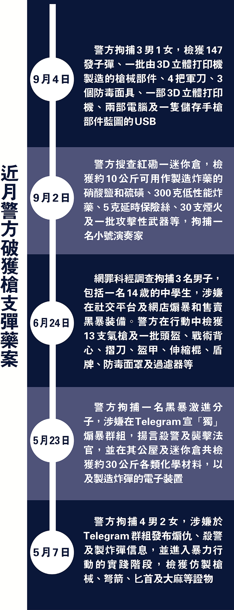 據香港文匯報記者初步統計,過去兩年警方最少搗破15宗涉及黑暴或本土恐怖活動槍彈案,拘捕密謀「孤狼式恐襲」、「網上宣獨煽暴」群組等黑暴餘黨50多人,檢獲70公斤不同種類爆炸品或爆炸品原材料、近300支長短仿製槍或真槍、近7,000發不同型號子彈、數以百計不同攻擊性武器及黑暴裝備等。