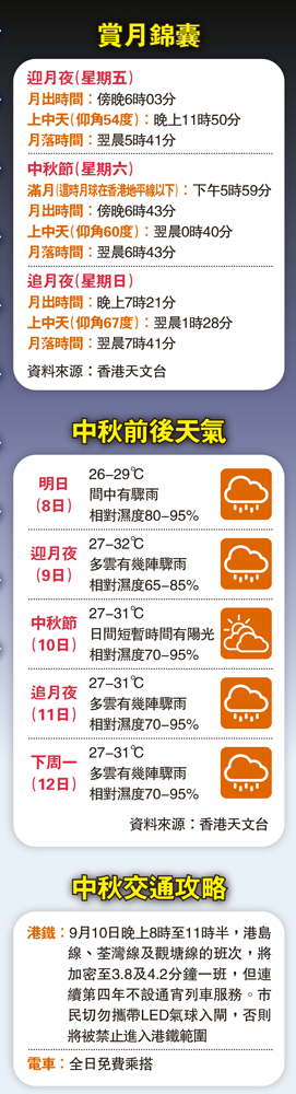 (大公報 記者 曾敏捷、伍軒沛<文> 林少權、蔡文豪、何嘉駿、麥潤田<圖>)本周六是中秋節,各區綵燈已紛紛亮起,「東方之珠」更加璀璨!