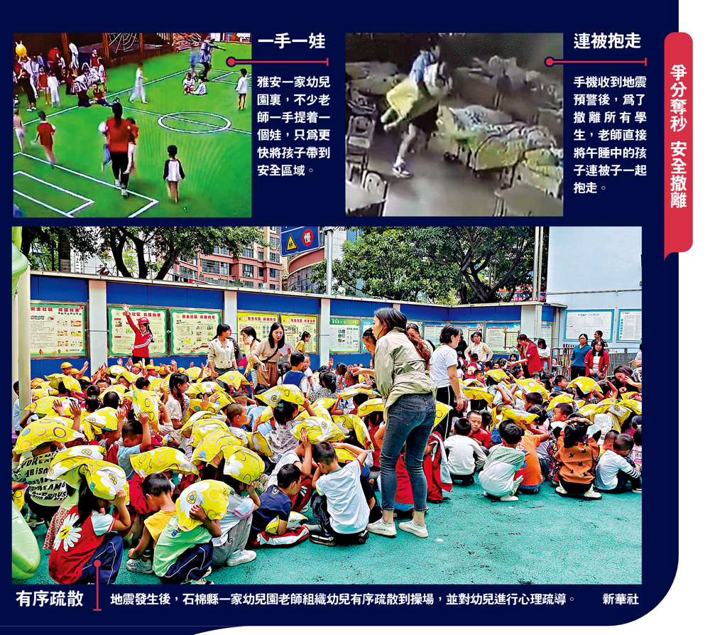 (大公報 記者 向芸)9月5日,四川甘孜州瀘定縣發生6.8級地震。四川多地震感明顯,地震瞬間,當地許多公共視頻記錄下老師組織學生有序撤離的畫面。老師們地震瞬間臨危不亂,將睡夢中的孩子連被捲走,一手一娃,令人動容。一位幼兒園園長表示,因為學校每個月都有一次地震應急演練,老師清楚自己的流程站位,得以在一分鐘左右就將全校270名學生全部安全撤離。教育部6日舉行的新聞發布會上,教育部教師工作司司長任友群透露,在這次地震中,四川的老師們臨危不亂,迅速有序轉移學生,守護學生生命安全,為他們點讚。