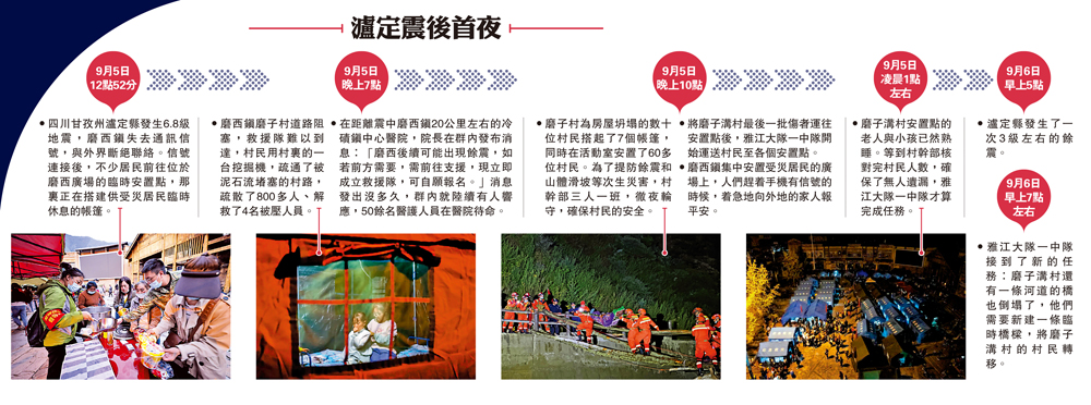 四川森林消防總隊甘孜支隊雅江大隊一中隊消防員丁則尼瑪介紹,該隊在5日下午抵達磨西鎮磨子溝村,開始運送傷者。當晚10點左右,將最後一批傷者運往安置點後,雅江大隊一中隊緊接着便開始運送村民至各個安置點。
