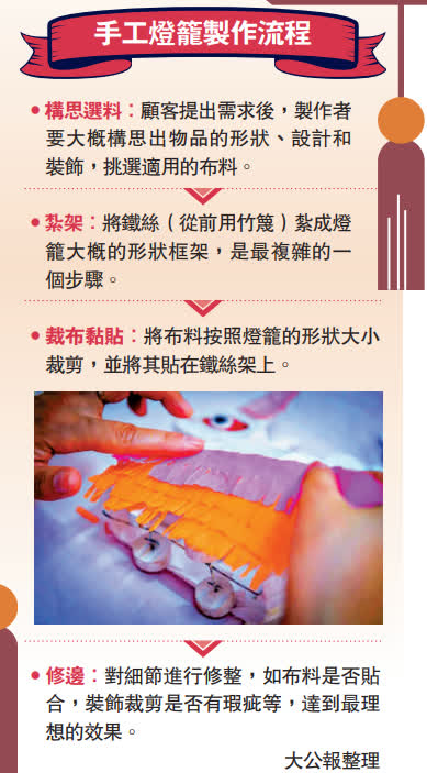 手工燈籠製作繁複,尤其是涉及產品創新。「現在一般是先畫好草圖,批量用鐵線做好架子,再進入貼布料環節。」英姐說,這樣的流水作業能提高效率,但即便是英姐這樣的「熟手女工」,做一個「金魚」燈籠也需要兩個小時。