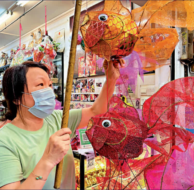被親切喚為「英姐」的老闆娘彭少英一手接過顧客選定的燈籠,一手裝好電池亮燈,確定沒有問題後才扯上一個紅色塑膠袋裝起來。不過更多人喜歡把燈籠拿在手裏,邊走邊玩。