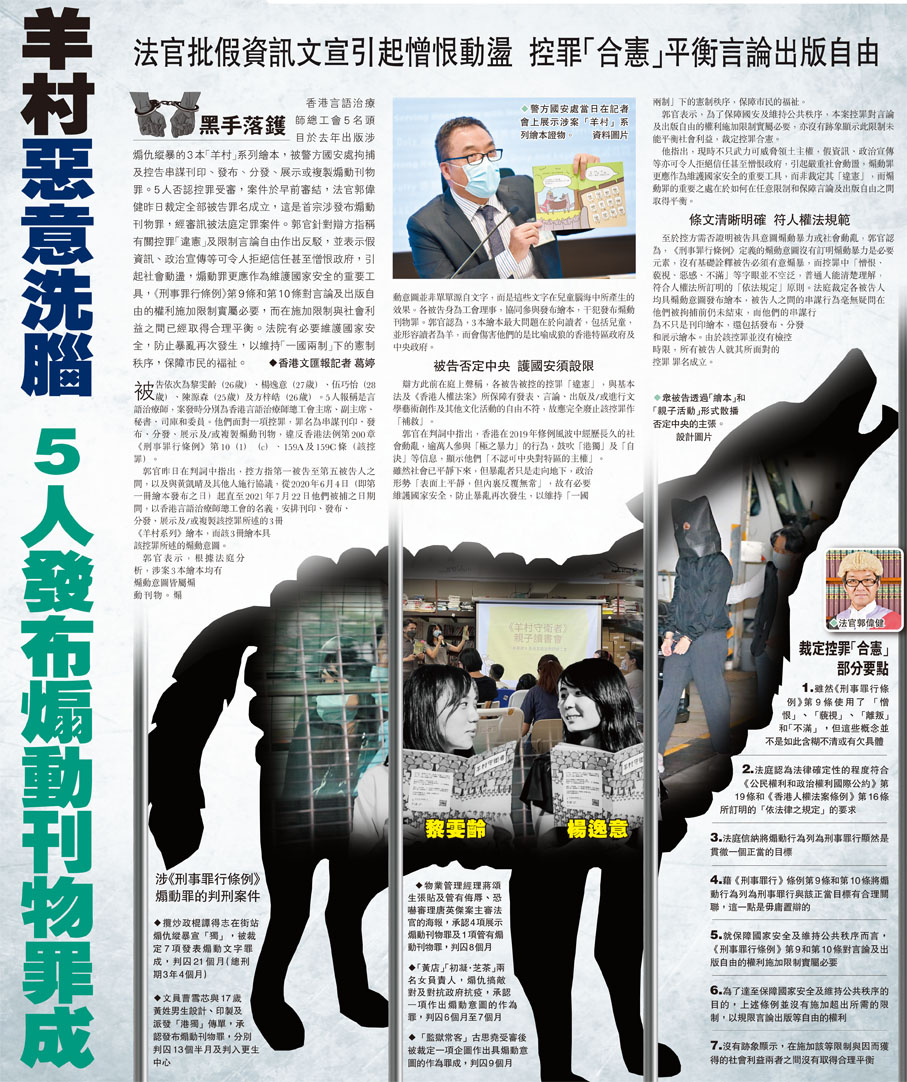 (香港文匯報 記者 葛婷)香港言語治療師總工會5名頭目於去年出版涉煽仇縱暴的3本「羊村」系列繪本,被警方國安處拘捕及控告串謀刊印、發布、分發、展示或複製煽動刊物罪。5人否認控罪受審,案件於早前審結,法官郭偉健昨日裁定全部被告罪名成立,這是首宗涉發布煽動刊物罪,經審訊被法庭定罪案件。郭官針對辯方指稱有關控罪「違憲」及限制言論自由作出反駁,並表示假資訊、政治宣傳等可令人拒絕信任甚至憎恨政府,引起社會動盪,煽動罪更應作為維護國家安全的重要工具,《刑事罪行條例》第9條和第10條對言論及出版自由的權利施加限制實屬必要,而在施加限制與社會利益之間已經取得合理平衡。法院有必要維護國家安全,防止暴亂再次發生,以維持「一國兩制」下的憲制秩序,保障巿民的福祉。