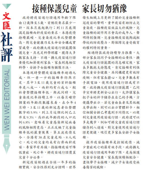 政府將疫苗通行證適用年齡下限由12歲降至5歲,首階段要求最少一針,從本月底起執行;到11月底須滿足接種兩針疫苗的要求。本港疫情持續嚴峻,兒童染疫比率比整體要高,對兒童健康乃至生命安全構成實質威脅。政府擴大疫苗通行證範圍保護兒童,具充足科學理據,獲得大多數家長支持。不過,擴大疫苗通行證要優化細節便利家長,家長則應相信科學,安排子女接種勿猶豫不決。