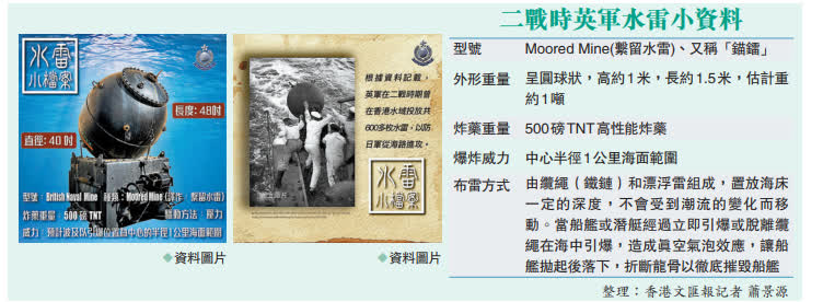 爆炸品處理課署理高級炸彈處理主任李展超昨日表示,該枚水雷屬二次大戰時英軍所用的標準水雷,呈圓球形,高約1米、長約1.5米,估計重約1噸,估計內有500磅TNT高性能炸藥。當年,英軍為防衛日軍從海上入侵,將數百枚水雷放在香港不同水域。水雷本身有自我摧毀機制,約一定年期後會自我毀滅,惟今次香港首次找到完整、未破壞的水雷,相信在水底埋逾70年,且外殼生滿貝殼,並受海水侵蝕。