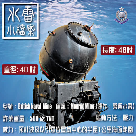 這是首次在本港水域發現一枚較為完整、超過70年歷史的水雷,相信是二戰時期遺留的英式水雷,內有五百磅TNT高性能炸藥,威力預計波及範圍是水雷位置方圓數百米至一公里內的海域。