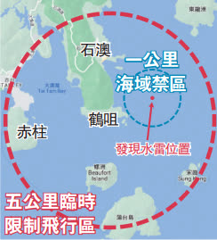 (大公報 記者 楊州)警方今日會處理一枚在鶴咀對開海域發現的水雷,海事處昨日中午12時至今日行動結束的一段時間內,封鎖水雷位置方圓一公里內的水域及五公里空域,其間船隻不得駛進封鎖範圍。