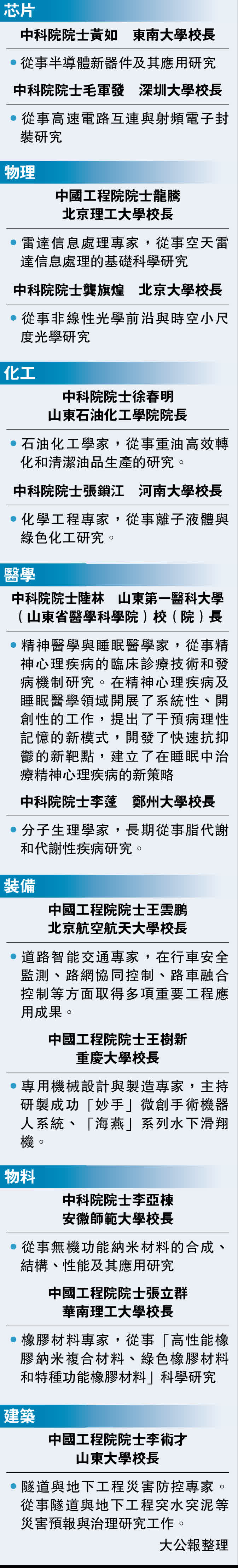 今年至少已有13名兩院院士履新內地高校校長(院長)。其中8位是中國科學院院士,5位為中國工程院院士,其科研方向涵蓋化工、材料、物理、醫學、裝備、建築等多個領域。
