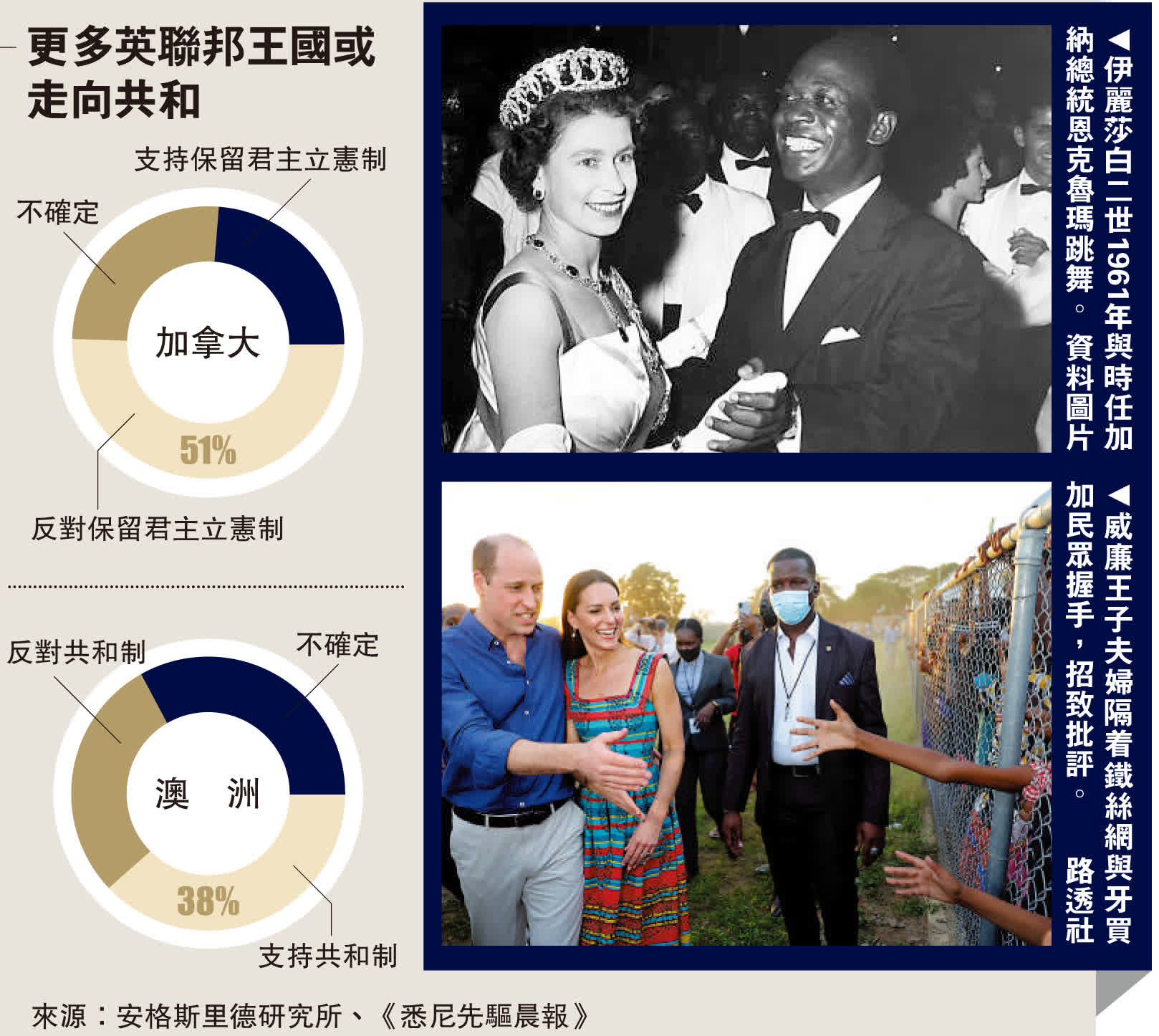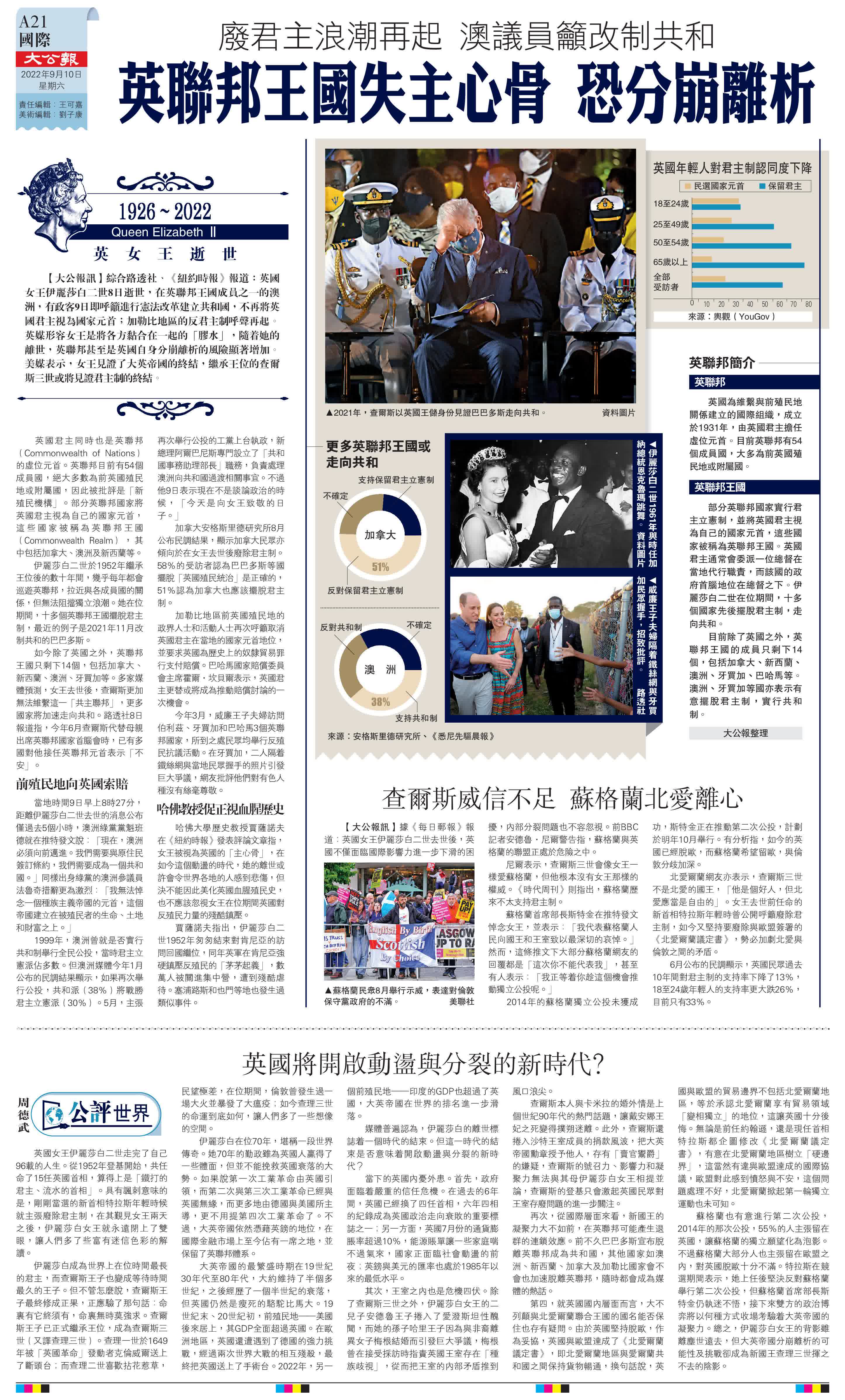 大公報綜合路透社、《紐約時報》報道:英國女王伊麗莎白二世8日逝世,在英聯邦王國成員之一的澳洲,有政客9日即呼籲進行憲法改革建立共和國,不再將英國君主視為國家元首;加勒比地區的反君主制呼聲再起。英媒形容女王是將各方黏合在一起的「膠水」,隨着她的離世,英聯邦甚至是英國自身分崩離析的風險顯著增加。美媒表示,女王見證了大英帝國的終結,繼承王位的查爾斯三世或將見證君主制的終結。