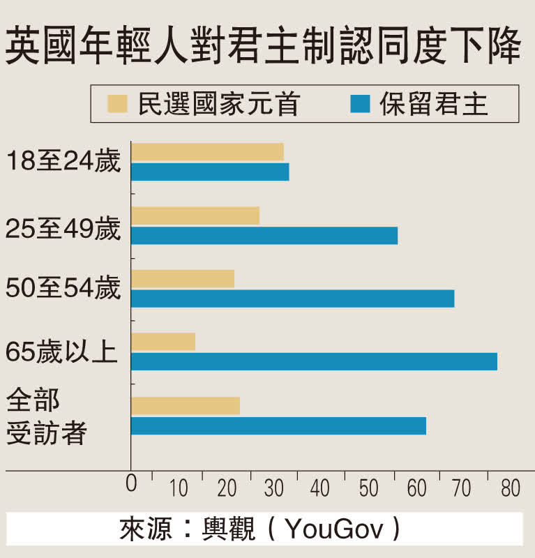 6月公布的民調顯示,英國民眾過去10年間對君主制的支持率下降了13%,18至24歲年輕人的支持率更大跌26%,目前只有33%。