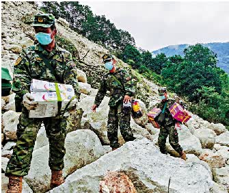 一路上,到處都是受損的房屋和垮塌的山體,甚至有坡度近70度的山路。消防隊員們將醫用裝備背在身上,或搭建繩橋,或搭建人梯,終於到達災民安置點。