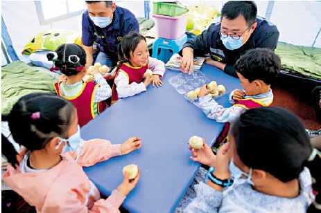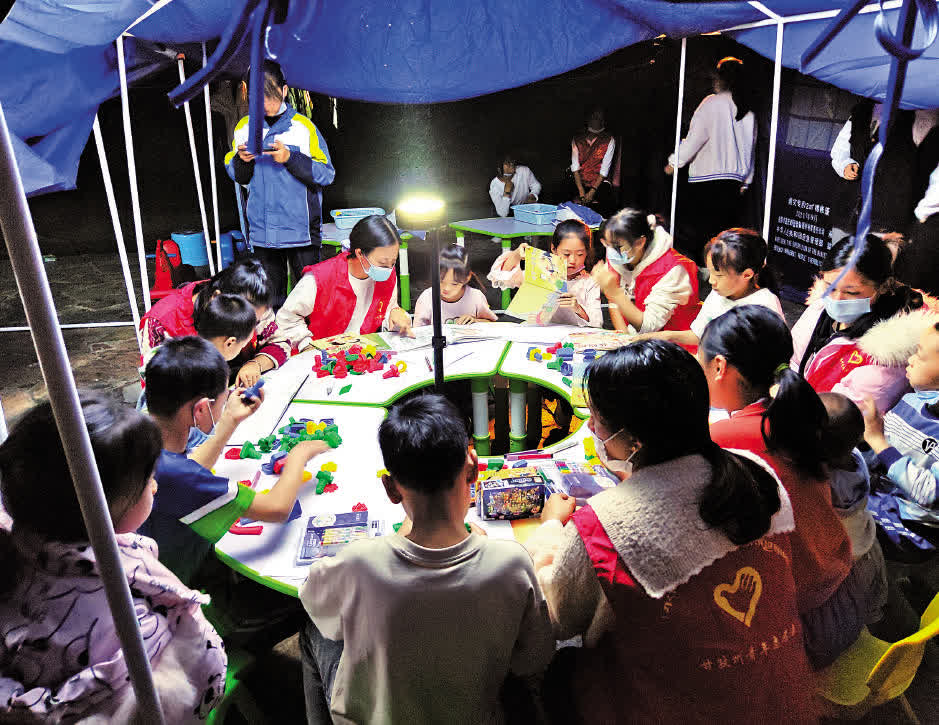 而6日晚上「青青兒童樂園」在安置點建起來後,曾海鵬看到了越來越多孩子聚在這裏。孩子們在老師和青年志願者的陪護下,玩遊戲、做手工、讀繪本、唱歌跳舞,「經過時能聽到孩子們稚嫩歡快的歌聲。」