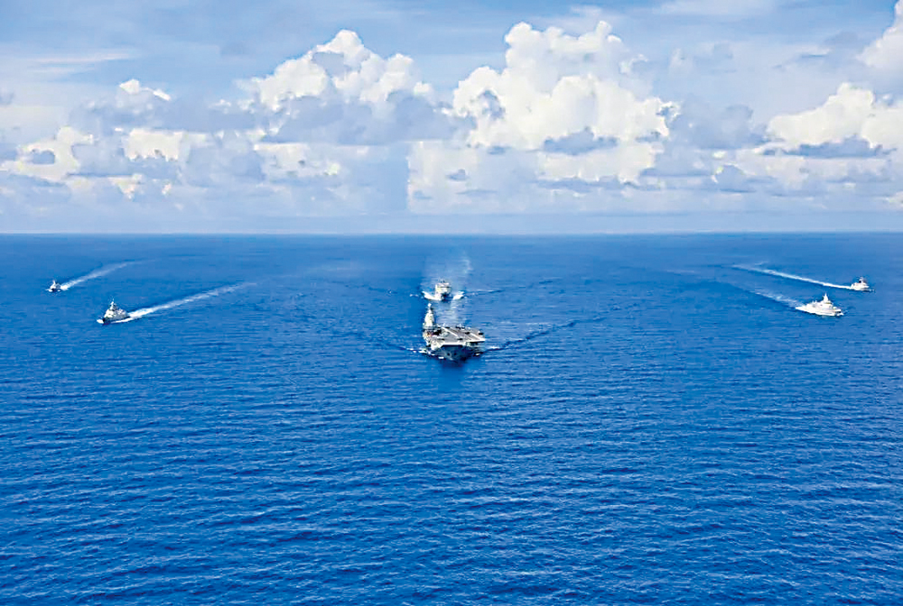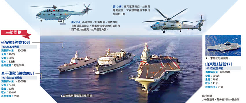 在編隊行進時,山東艦居中,901型補給艦位於正後方跟隨,055型及052DL型護衛艦分別在左前方、右前方護航,兩艘054A型護衛艦則位於後方兩翼,兩驅兩護形成了一個矩形,擔當拱衛航母的「帶刀侍衛」。航母艦載機執行空戰,驅逐艦側重反導、反艦,護衛艦側重反潛,補給艦擔當保障,各型作戰要素齊全,形成了山東艦航母戰鬥群的完備作戰體系。此次實戰化演習涵蓋了合同對海突擊、防空抗導、反潛警戒、艦機聯合搜救等各科目,各艦都進行了實際使用武器的訓練,具有鮮明的備戰打仗意義。