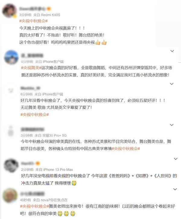 除在海內外同步播出外,今年秋晚還首次通過「百城千屏」超高清公共大屏傳播體系在全國70個城市270多塊戶外地標大屏8K同步播出。截至9月10日22時,央視多平台直播《中央廣播電視總台2022年中秋晚會》,受眾觸達總量達2.38億次。收穫全網熱搜超500個,#央視中秋晚會#主話題閱讀量超66億,相關話題閱讀總量超過77億,相關視頻全網播放總量近9億。通過各平台收看秋晚的海內外受眾點讚稱:「央視中秋晚會美到了我」「傳統文化與新技術的結合太夢幻」「沒看夠,好有意境,央視審美就是牛」「看秋晚,想家了」……