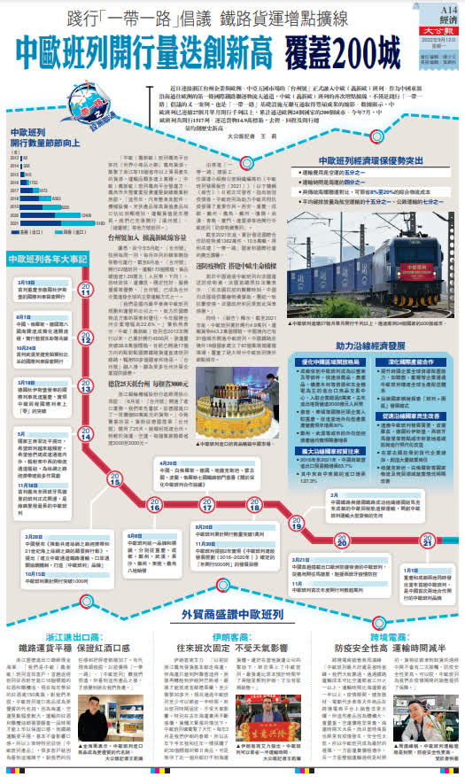 (大公報 記者 王莉)近日連接浙江台州企業與歐洲、中亞五國市場的「台州號」正式融入中歐(義新歐)班列。作為中國東部沿海通往歐洲的第一條國際鐵路聯運物流大通道,中歐(義新歐)班列的再次增點擴線,不僅是踐行「一帶一路」倡議的又一案例,也是「一帶一路」基礎設施互聯互通取得豐碩成果的縮影。數據顯示,中歐班列已連續27個月單月開行千列以上,累計通達歐洲24個國家的200個城市。今年7月,中歐班列共開行1517列、運送貨物14.9萬標箱,去程、回程及開行總量均創歷史新高。