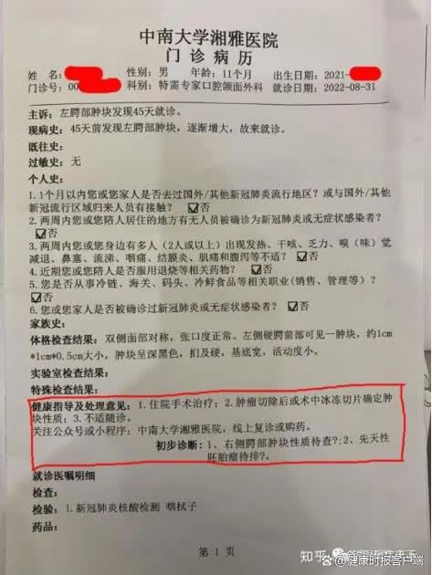 據健康時報報道,近日,處於輿論風口浪尖的湘雅系醫院再次登上熱搜。湖南長沙有家長反映11個月大孩子上顎出現黑色腫塊,花300元在中南大學湘雅醫院看專家號,專家初步診斷疑似腫瘤,待查待排。處理意見是住院手術治療。
