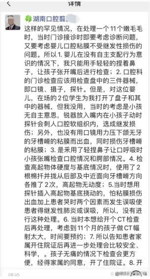 9月12日,翦醫生再次在朋友圈發布了回應,「我把我當時為什麼沒有直接用口腔探針去從這個物體底部撓動,是怕造成嬰兒口腔粘膜的繼發性損傷,如果一個11個月的孩子出現窒吸門診沒有處理條件,而改用2根棉扦並擾探試物體硬度和基底的寬度後,而爭得患者父母同意開住院證入院進一步處理。」