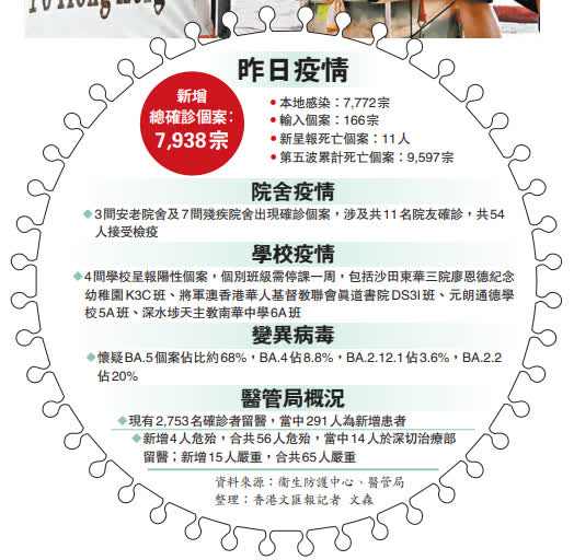 香港昨日共新增7,938宗確診個案,包括7,772宗本地確診個案及166宗輸入個案。張竹君昨日在疫情簡報會上表示,近日每日確診宗數有稍微靠穩及回落的跡象,但未知是否與中秋假期有關,仍然需要繼續密切關注走勢,「要看中秋假期之後確診數字會否反彈,看BA.5所佔的傳播個案會否進一步上升等等,現時的佔比是68%。」