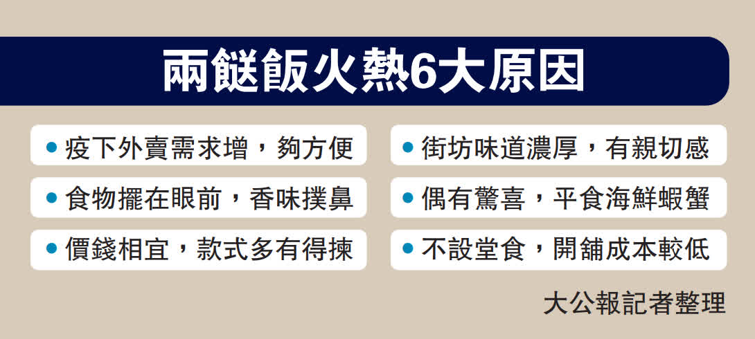 兩餸飯在香港其實不是新鮮事物,午飯時間走在街頭,不時見到百米人龍排隊購買,人龍中有很多是穿着光鮮的上班族。