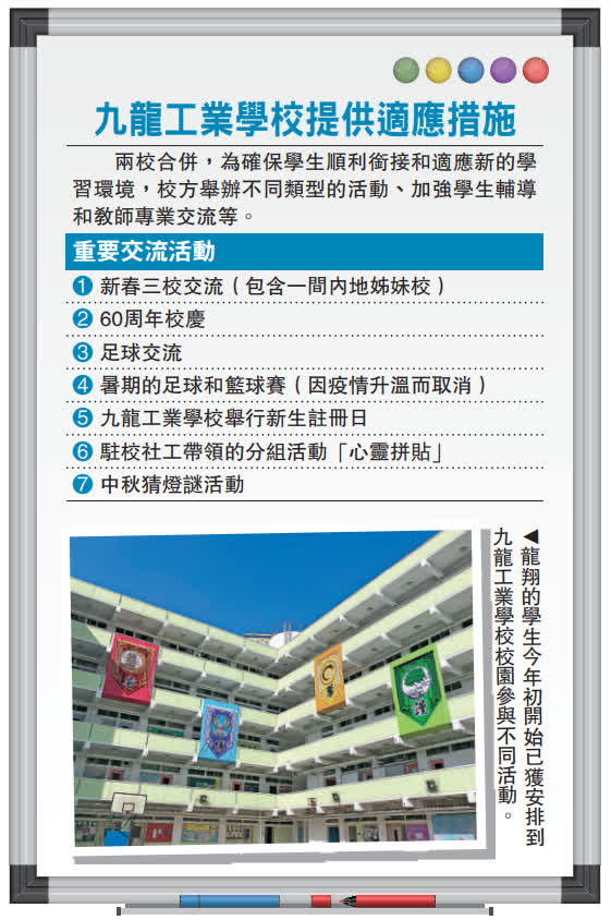 龍翔官立中學與九龍工業學校本學年初正式開始合併,為了令57名來自龍翔的學生更快適應九龍工業學校的學習生活,一直作為龍翔姊妹校的九龍工業學校,自本年1月初起已安排龍翔的學生參與九龍工業學校的活動,新學年亦開辦不同活動給龍翔舊生,令他們盡快適應新校園。