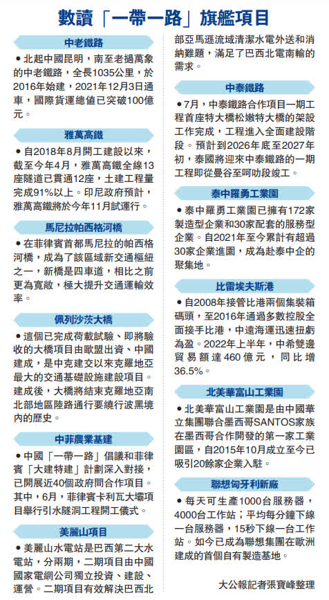 (大公報 記者 譚旻煦、丁春麗、張寶峰)中國國家主席習近平提出「一帶一路」倡議至今,中國提出的政策溝通、設施聯通、貿易暢通、資金融通、民心相通「五通」理念,在各個領域成果顯著。「五通」理念中,政策溝通不僅是「一帶一路」的重要保障,在搭建合作框架、凝聚發展共識、形成建設合力等方面更發揮了重大作用。截至今年7月底,中國已與149個國家、32個國際組織簽署200多份合作文件,擴大朋友圈,賦能 「一帶一路」高質量發展。其中,中老鐵路通車9個月,國際貨運總值已突破100億元人民幣,成為聯繫中國與東盟國家的「黃金線」。