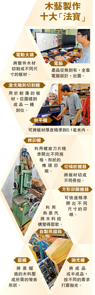 除了電腦外,鐳射切割雕刻機、電動化鋸床、厚度精準到0.1毫米的刨平機、開造榫卯的精準機器等等,一一呈現在記者眼前。「這台是歐美產的刨平機,用的是螺旋刀片,摩擦力較小,相比日本或國產的直刀片刨平機好用,且噪音更低。」吳細緻說出每一台機器的功能:「這台就是利用螺旋刀片製作出各種形狀的榫卯機器,旁邊這一台是打卯眼的機器。」他隨手拿出一節四方木板,放在卯眼機下,不足10秒鐘,一個深約1吋的長方形卯眼已打好,較傳統用鋼鑿一下一下用手工鑿製的榫卯,不但節省時間,且成品更精準易接合。