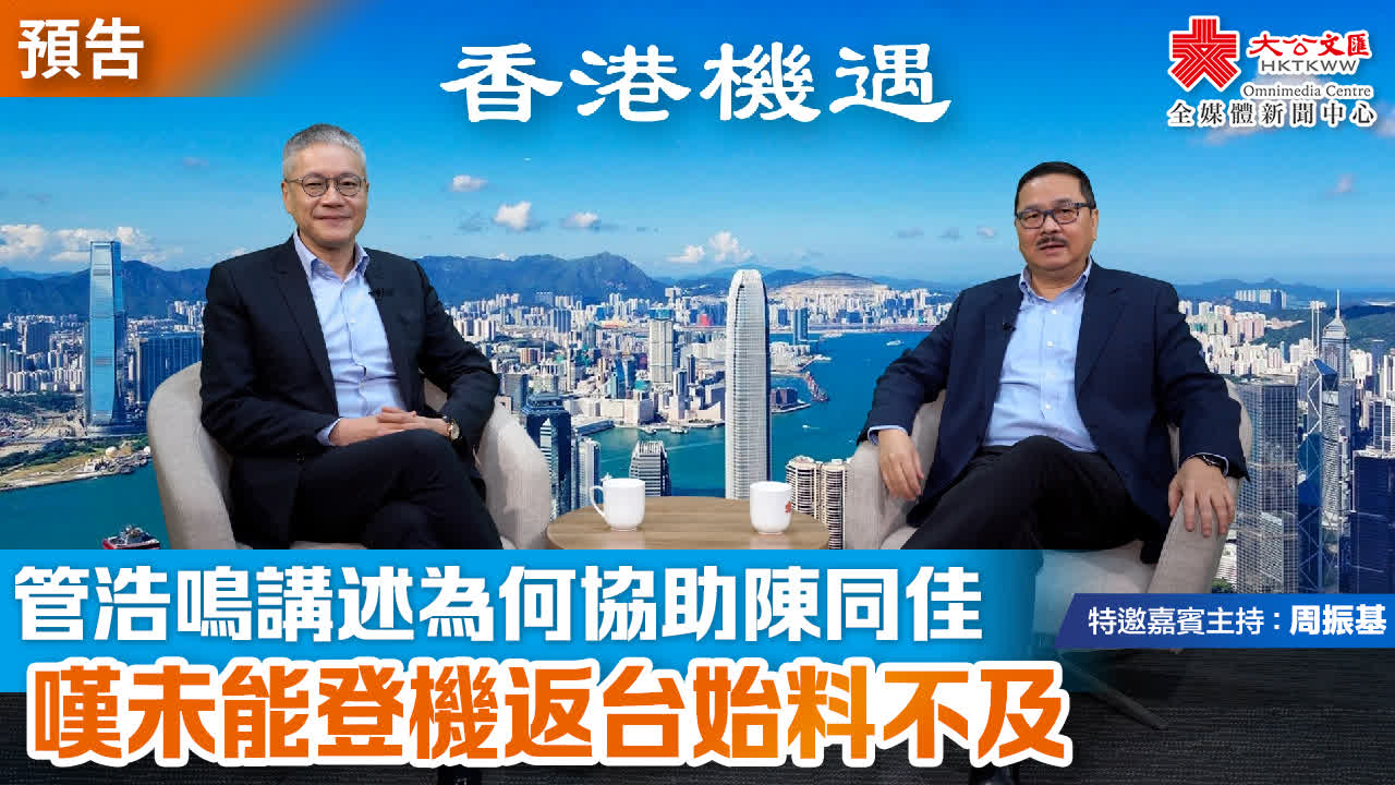 今期大公文匯全媒體《香港機遇》邀請到第七屆立法會議員管浩鳴牧師。很多人認識管浩鳴,都是因為他協助台灣殺人案疑犯陳同佳,卻很少人知道為什麼管浩鳴要幫他。对此,管浩鳴说,因為陳同佳和潘曉穎以前都是聖公會旗下學校的學生,所以當他聽到這件事情時,就覺得是上帝給他的感召,就想去探監,希望勸服陳同佳去台灣自首。但事實往往比想像中更複雜,管浩鳴慨嘆,沒想到人被勸服了,卻連上飛機都做不到。