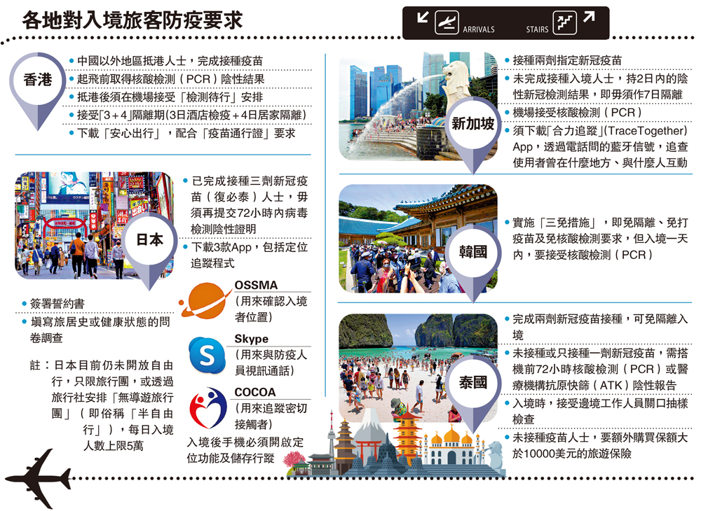 至於外國如何放寬入境檢疫限制,本港少有介紹,原來涉及不少精準抗疫措施。當中,日本政府上月底宣布,開放外國旅客免檢測入境,由9月7日起更放寬至「半自由行」,即無導遊旅行團入境,暫時每日上限五萬人,已完成接種三劑疫苗的人士,甚至毋須持有出發前的核酸檢測陰性證明,但要求入境人士必須下載具有追蹤功能的手機應用程式。