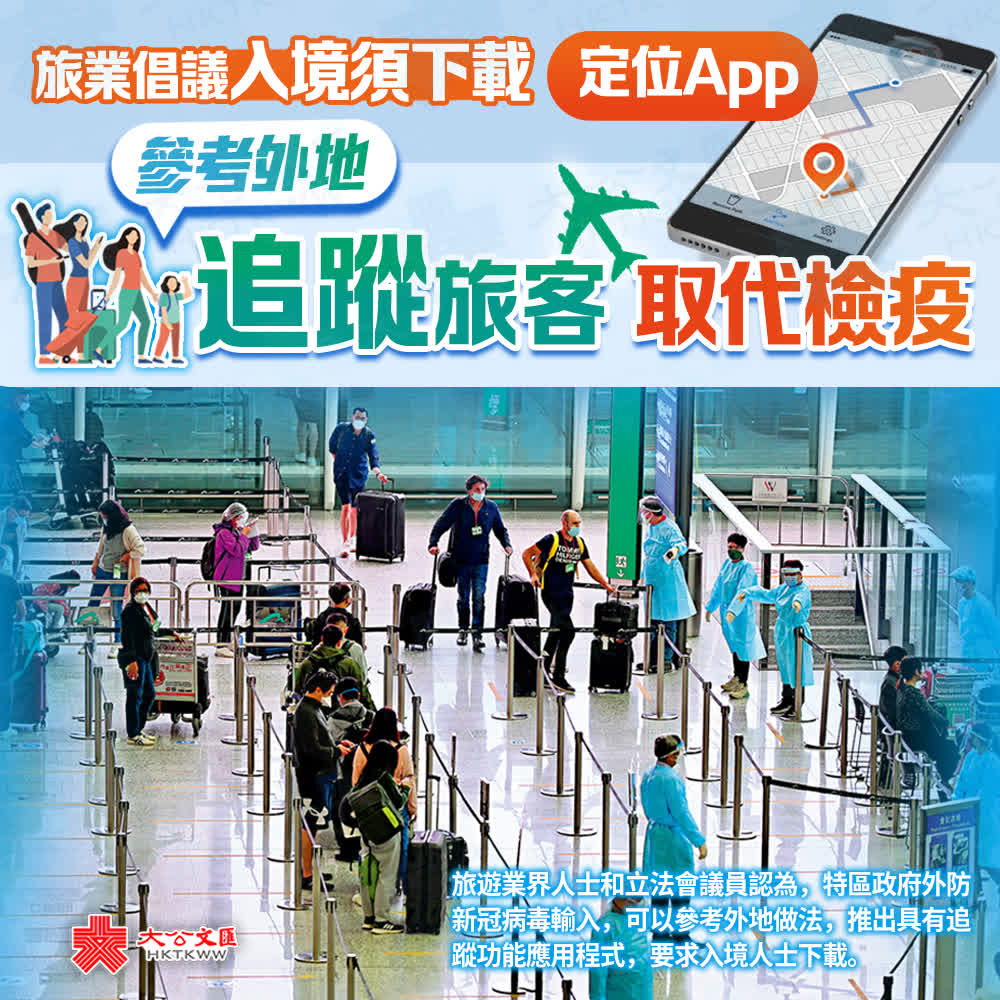 有旅遊業界代表和立法會議員指出,現時到日本旅遊,除了必須完成接種三劑新冠疫苗,同時要求入境人士下載具有追蹤功能的手機應用程式,特區政府若要進一步放寬入境隔離要求,可以仿效有關做法,推出具有追蹤功能應用程式,要求入境人士必須下載。