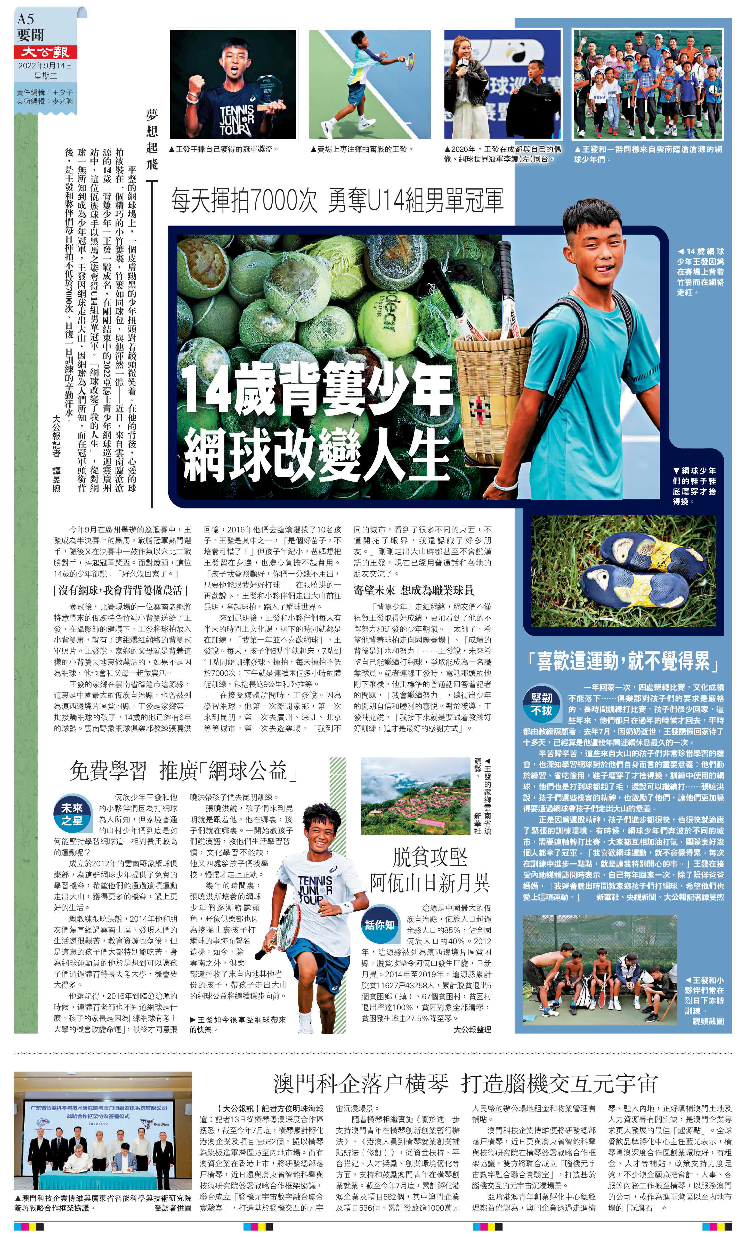 (大公報 記者 譚旻煦)平整的網球場上,一個皮膚黝黑的少年扭頭對着鏡頭微笑着。在他的背後,心愛的球拍被裝在一個精巧的小竹簍裏,竹簍如同球包,與他渾然一體—近日,來自雲南臨滄滄源的14歲「背簍少年」王發一戰成名,在剛剛結束中的2022亞瑟士青少年網球巡迴賽廣州站中,這位佤族球手以黑馬之姿奪得U14組男單冠軍。「網球改變了我的人生」,從對網球一無所知到成為少年冠軍,王發因網球走出大山,因網球為人們所知,而在冠軍頭銜背後,是王發和夥伴們每日揮拍不低於7000次、日復一日訓練的辛勤汗水。