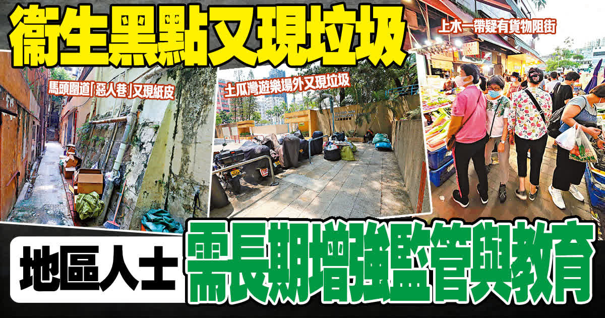 早前,馬頭圍道「惡人巷」清潔過後整潔一新,惟有地區人士反映該處在3天後即再現垃圾,記者前日現場直擊亦見到紙皮。土瓜灣遊樂場入口「垃圾陣」曾連綿20餘米,在「政府打擊衞生黑點計劃」下一度被清掃乾淨,惟記者前日直擊現場發現又有大袋垃圾開始堆積,還有紙箱擺放在垃圾箱外。另外,阻街的罰則少於擴大店面的租金,令這一類型的衞生黑點情況始終無法根除。記者前日到上水龍豐花園附近一帶直擊店舖阻街的情況。有店家見到記者影相時立即上前阻止,同時急匆匆開始搬移阻街貨物,但記者仍在現場觀察到較為普遍的阻街情況。