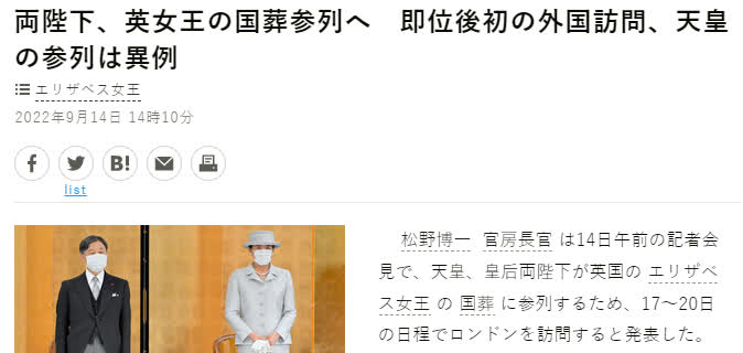 多國領袖及王室成員都獲邀出席英國女王伊麗莎白二世的國葬。據《朝日新聞》報道,日本官房長官松野博一今日(14日)表示,日本天皇、皇后將出席英女王的葬禮,首相岸田文雄將不出席。