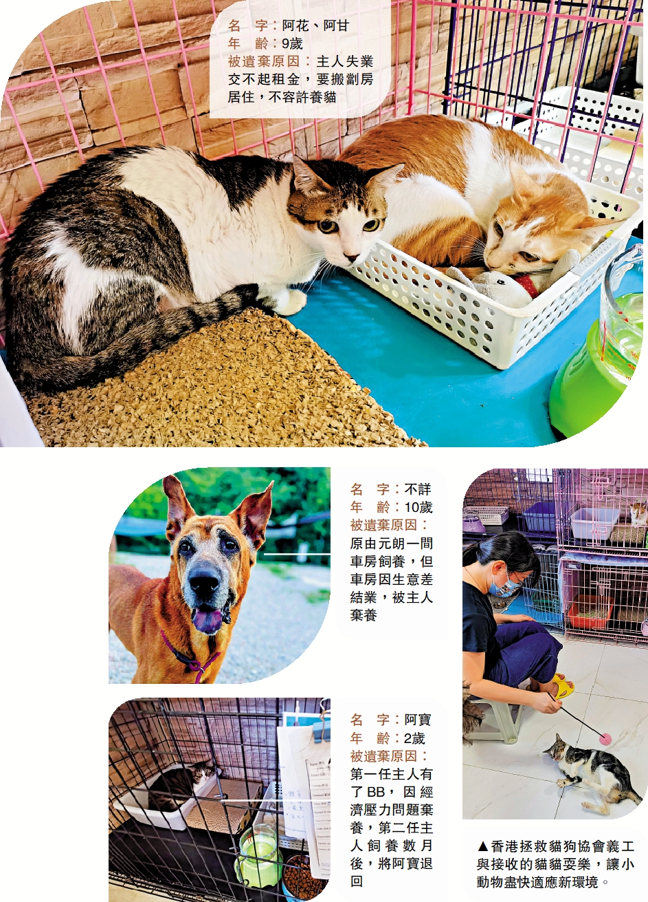 「上月底,協會就收到好幾隻被遺棄的家貓,其中這對9歲大的叫阿甘和阿花,就是因主人失業交不起租要搬去劏房住,而環境又不容許養貓,只能無奈將該對養了多年的貓貓交來協會。」香港拯救貓狗協會的資深義工李小姐,指着該對蜷縮在宿舍中無精打采的家貓向記者說。