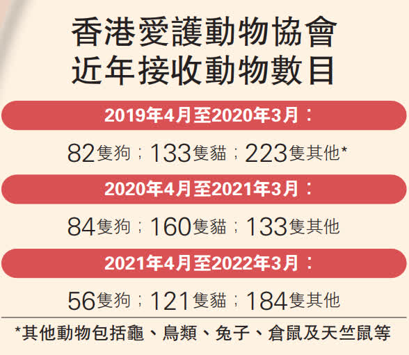 另外,香港愛護動物協會表示,去年接獲有關移民的棄養查詢明顯比之前更多,大部分主人都是基於移民手續繁複及需時間較長而棄養。由於該會資源及空間有限,當原本已在中心接受治理及尋家的動物數量太多時,接收棄養動物的數字便相應減少。協會的院舍同樣面臨領養遠追不上收養問題,院舍出現迫爆情況,因此,今年接收動物的數字未能反映真實棄養情況。