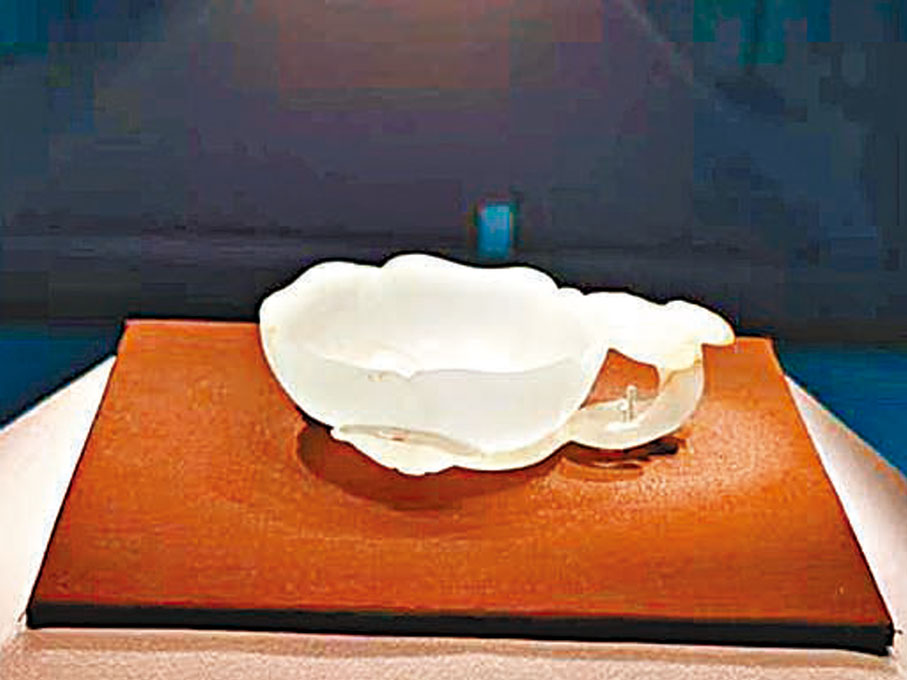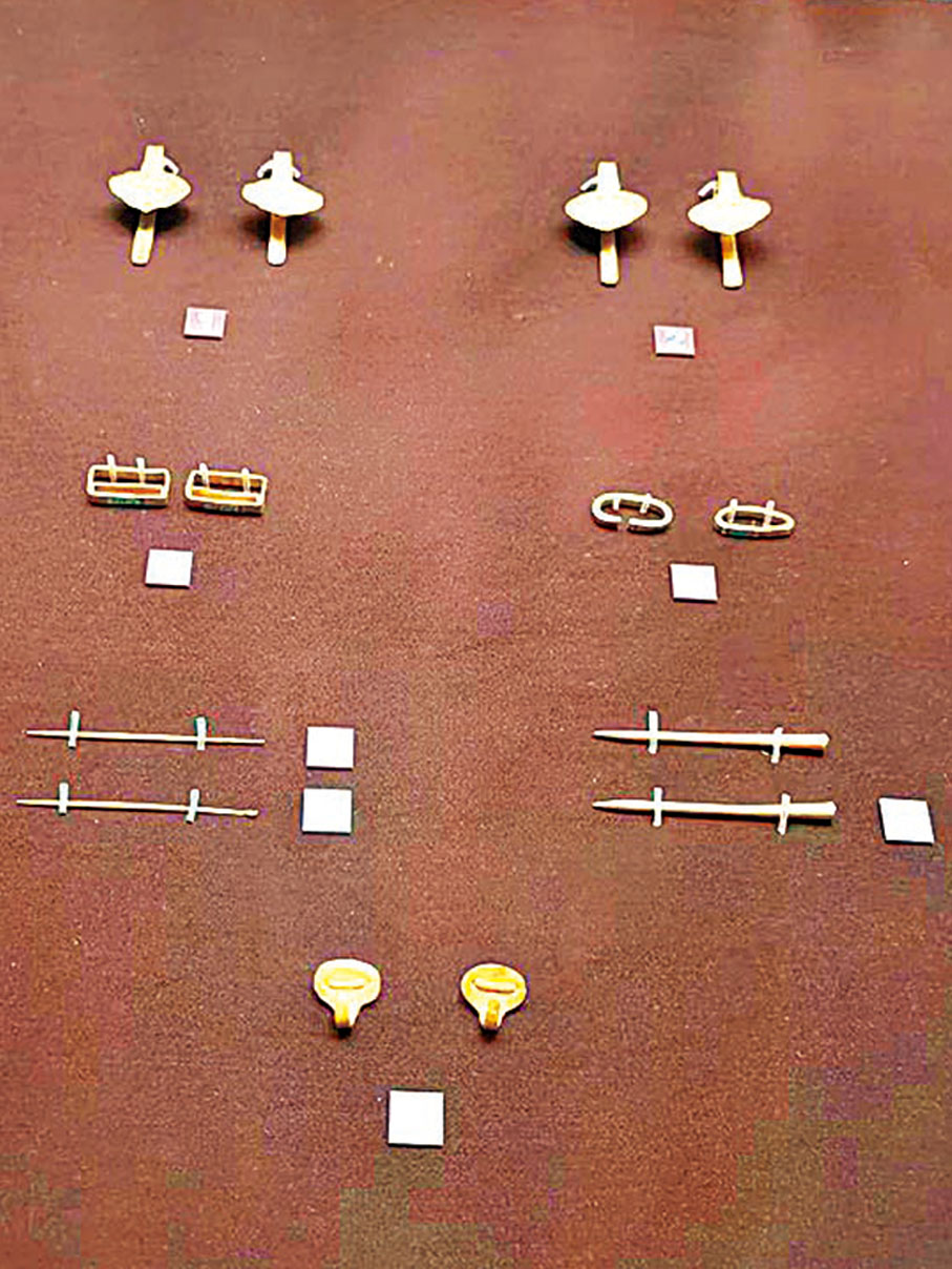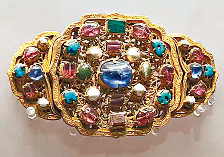 鑲寶石金帶飾則是魯荒王朱檀墓出土文物裏最華麗的一件文物。據蔣群介紹,這件金帶飾上面鑲有33顆寶石,有藍寶石、貝珠、紅寶石、綠松石和貓眼石。「一件金器上鑲嵌這麼多寶石的文物是非常罕見的,像這個紅色尖晶石就和英國女王皇冠上的紅色尖晶石是一樣的。」 蔣群表示。